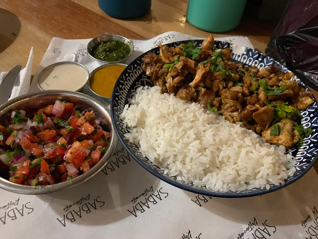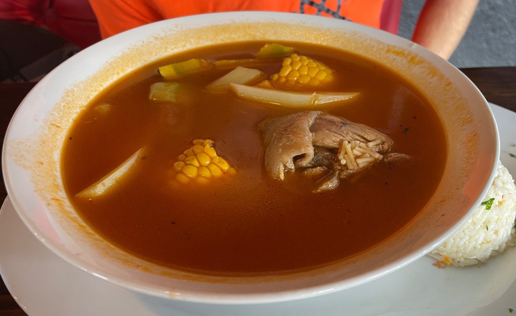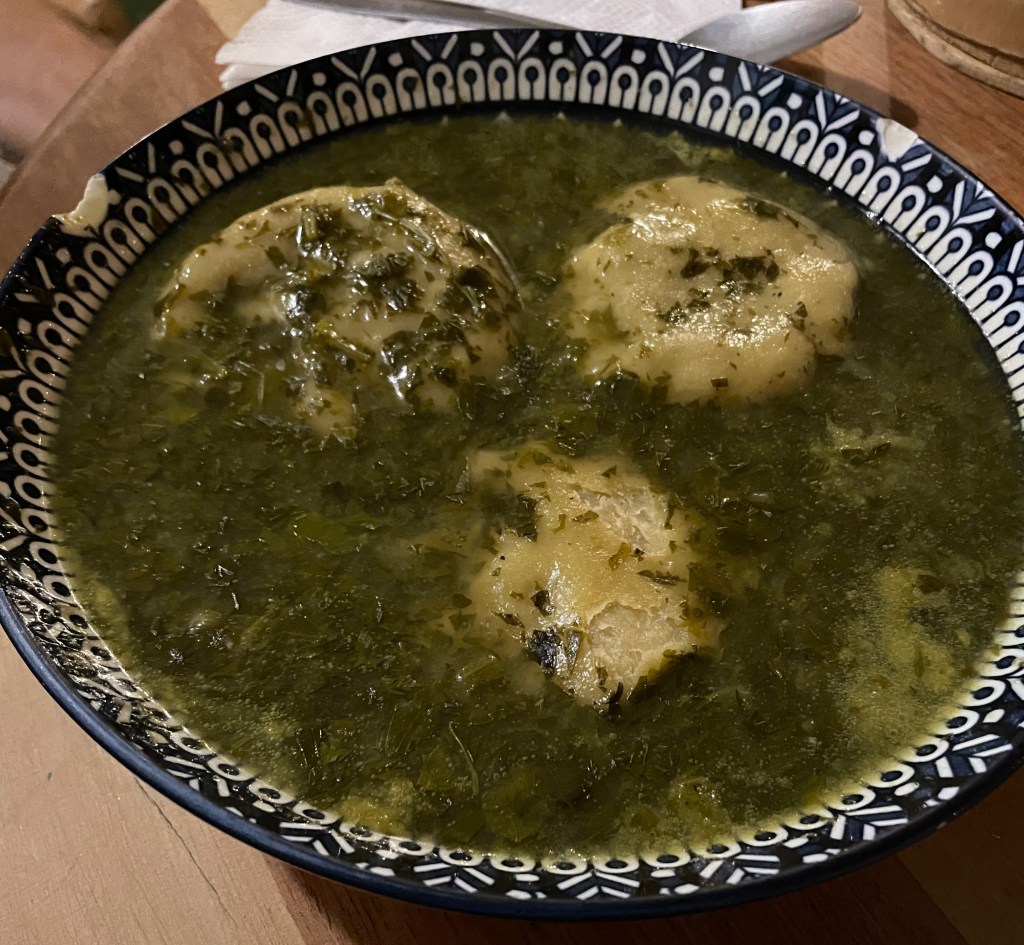 Since San Pedro has so many Israelis, we couldn’t quite resist familiar flavors. Tahini is as vital to life as water in my opinion, so the chance to have some “in the wild” feels like such a luxury and comfort. Normally, we try to visit a different restaurant every meal, but we visited one restaurant, Sababa, twice. The first time, we both got salads. I had the lentil & greens with tahini; Adam had the tuna. (The tuna, by the way, was Israeli tuna that tastes like cat food and did a bit of a number on Adam’s stomach. IYKYK.) The next time, Adam got the kubbeh hamusta soup, a sour soup with semolina dumplings stuffed with beef. Not the best he’s had, but definitely comforting. I had the chicken shawarma, which came with tahini, zhoug (a spicy cilantro-cardamom condiment), and amba (a pickled mango and fenugreek condiment – it’s as polarizing as it sounds).