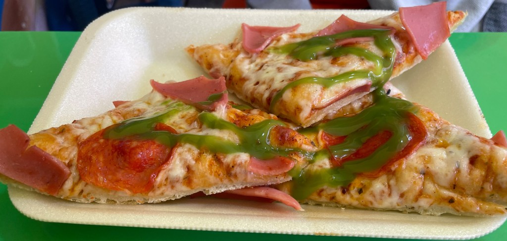 In Santiago D’Atitlàn, Adam ordered a beautiful chicken soup. He had a choice of either roasted chicken or chicken cooked in the broth, which was a fun option. Adam opted for the chicken cooked in the broth. (Correct choice.) You can’t tell from the photo, but there’s a huge chicken leg in that bowl of soup. When we walked around the market, we found ourselves in a somewhat abandoned carnival that had pizza by the slice. Obviously Adam couldn’t resist. His review: a chewy dough with a nice crunchy bottom, not too saucy or cheesey, and even the meat was sliced thin enough so that it didn’t overwhelm the overall flavor. The jalepeño sauce on top wasn’t too spicy, even though it looks kind of goopy.