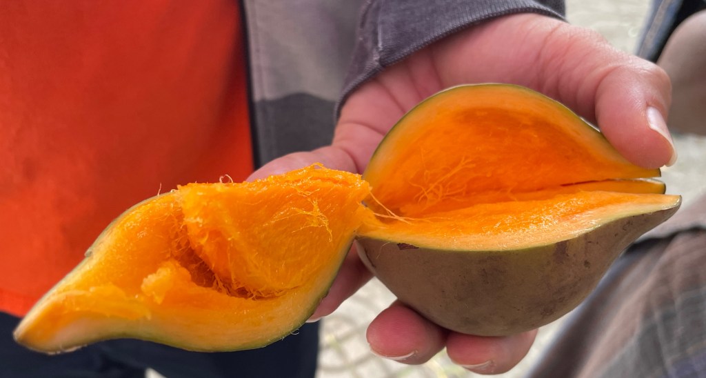 Then, an elderly woman came to us selling fresh fruit. We said no, no, but I couldn’t stop looking. She could tell I was curious, so she kept asking. Adam reluctantly said okay, and she went to her friend to borrow a knife. She cut it and peeled it for us so that we could eat it right there. For 10Q ($1.30) she sold us one sapote and it was lovely. It’s stringy like a mango, but with a mild tropical flavor reminiscent of mango and melon. She kept warning us not to eat the pits or the skin because it would make us sick. (So typical of such a delicious fruit.) It was the perfect sweet treat to keep our blood sugar up in the heat between meals.