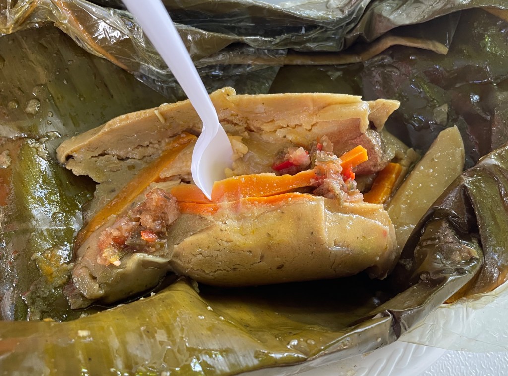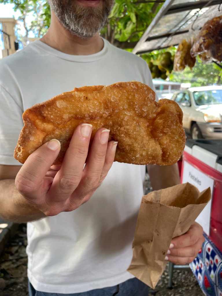 We also noticed that the lady running the stall sold cooked food. Initially we wanted to just buy the fruit and keep running errands but by the time we got to the car, we couldn’t stop thinking about having a little snack. Adam got the fried dough filled with chicken, which he enjoyed. Look at how big it is! I got the pastele filled with pork, potatoes, and carrots, and wrapped in a banana leaf. Pasteles are similar to tamales, but wrapped in banana leaves rather than corn husks. The flavors were very mellow and we added a homemade hot sauce that was just hot enough to add some zest. Salvadoran tamales are still my favorite, but this was the perfect dense snack to keep me going. She also poured us a cup of hot, well-sugared coffee. I didn’t get it at first, but when I had a sip I realized it was just what I needed. (More about that in a bit.)