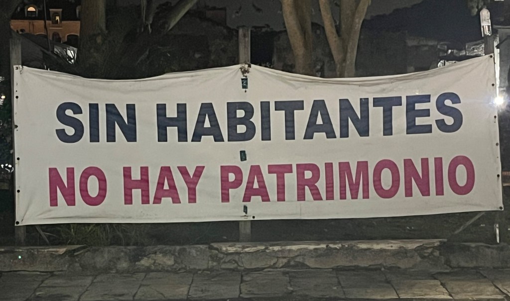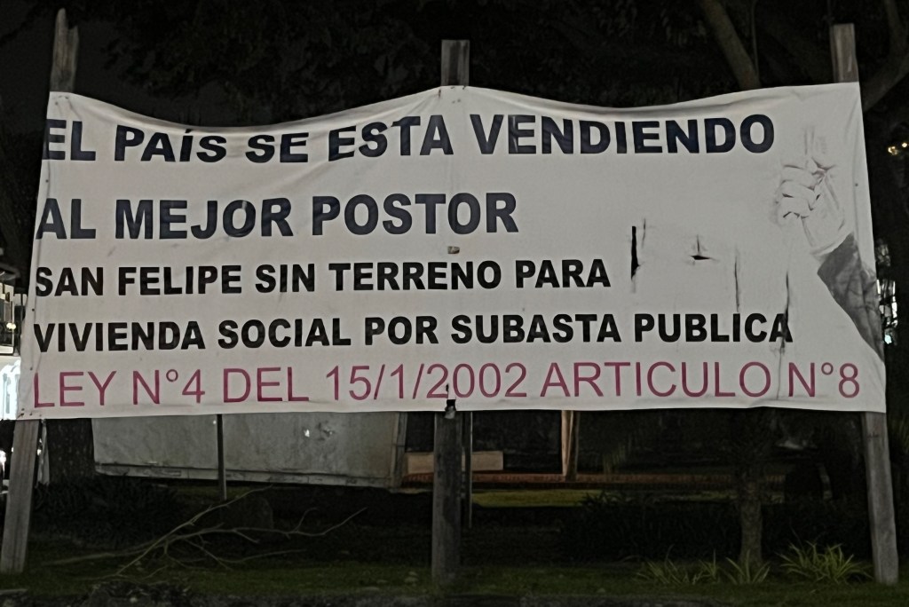 As is the case with so many gentrified neighborhoods, wealthy enclaves abut slums. We quickly discovered this when we searched for a tienda to purchase a SIM card and to drop off our laundry at the lavendería. We couldn’t help but notice the large protest signs pictured below. The sign on the left says: “The county is being sold to the highest bidder. San Felipe without land for social housing due to public auction. [Law number].” (San Felipe is another name for Casco Viejo.) The sign on the right says: “Without inhabitants there is no heritage.”