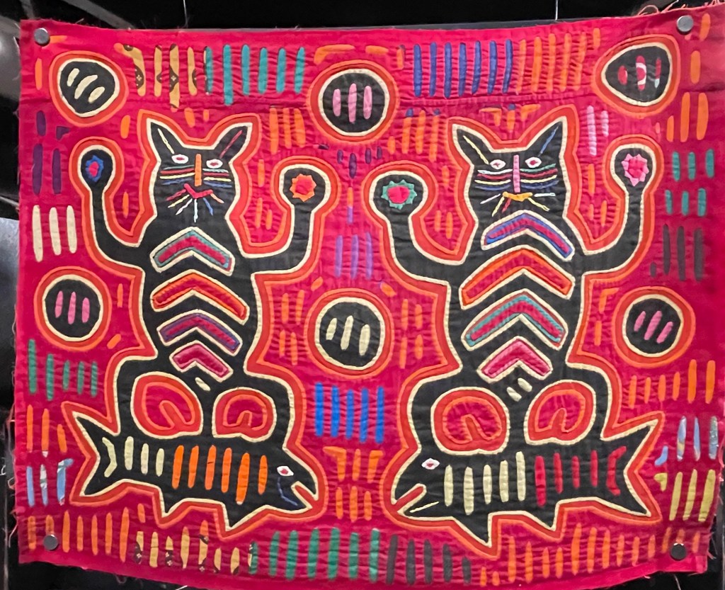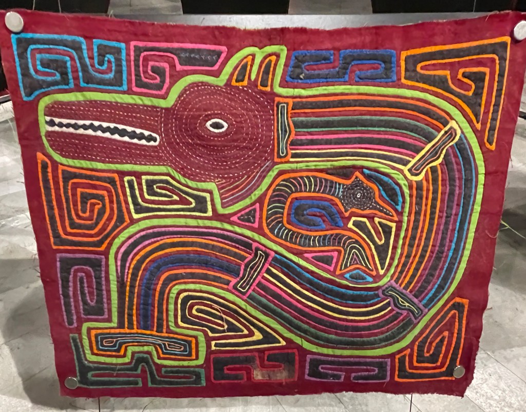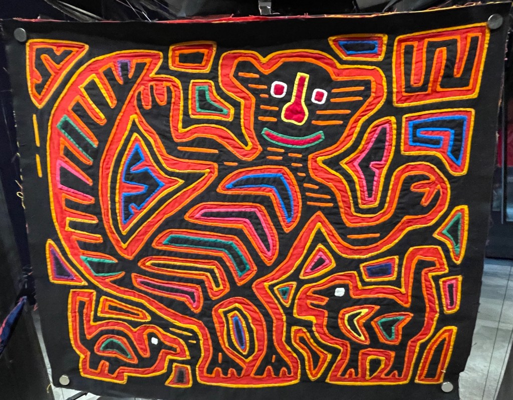 As such, we visited the Mola Museum in Casco Viejo that is dedicated to educating and preserving the textiles of the Guna People, an Indigenous people in Panamá. The molas are the textiles that the Guna women create for themselves. Below you can see a few photos of the intricate patterns they hand stitch using a reverse appliqué technique. In other words, layers of fabric are sewn on top of one another and cut out so that colors peak through. This is similar to how watercolor art paints shadows first and then layers of light are added. The designs have profound significance and they both protect and honor the women who wear them. The museum is small but free, and we highly recommend visiting if you’re in town.