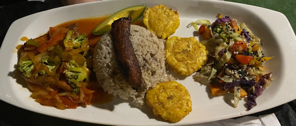 Once we were on Isla Bastimentos, the food options were pretty basic. However, we did manage to visit one Rasta restaurant that we enjoyed very much. We both wished it was open more often so that we could have tried more dishes. Adam ordered the pork chop and I ordered the vegetarian plate. They may look the same, but his pork chop is hidden under some cooked veggies in the left-hand photo. In addition to our excitement about the veggies, the coconut rice was some of the best I have had in a very long time.