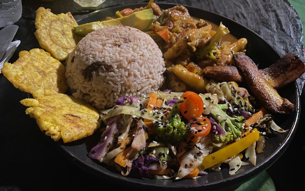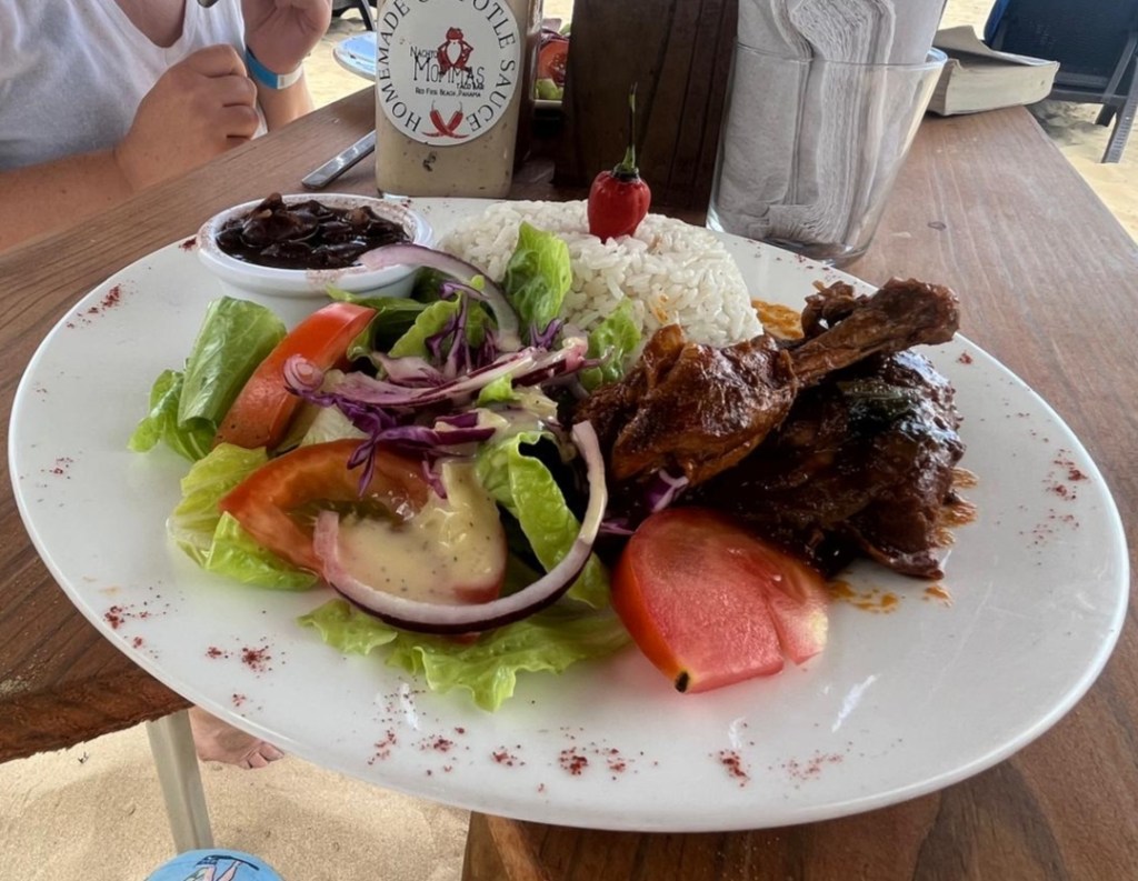 Our perfect beach day on Red Frog Beach included an excellent lunch. Typically, we try to order different food so that we can taste each other’s dishes when possible. (Yes, I am Susan from Ted.) However, this time we were both excited for the same chicken dish. Our server told us that it’s the traditional chicken pretty much everyone eats on Isla Bastimentos and the one locals order the most. Everything was flavored beautifully and the chili pepper on top of the rice wasn’t spicy at all.