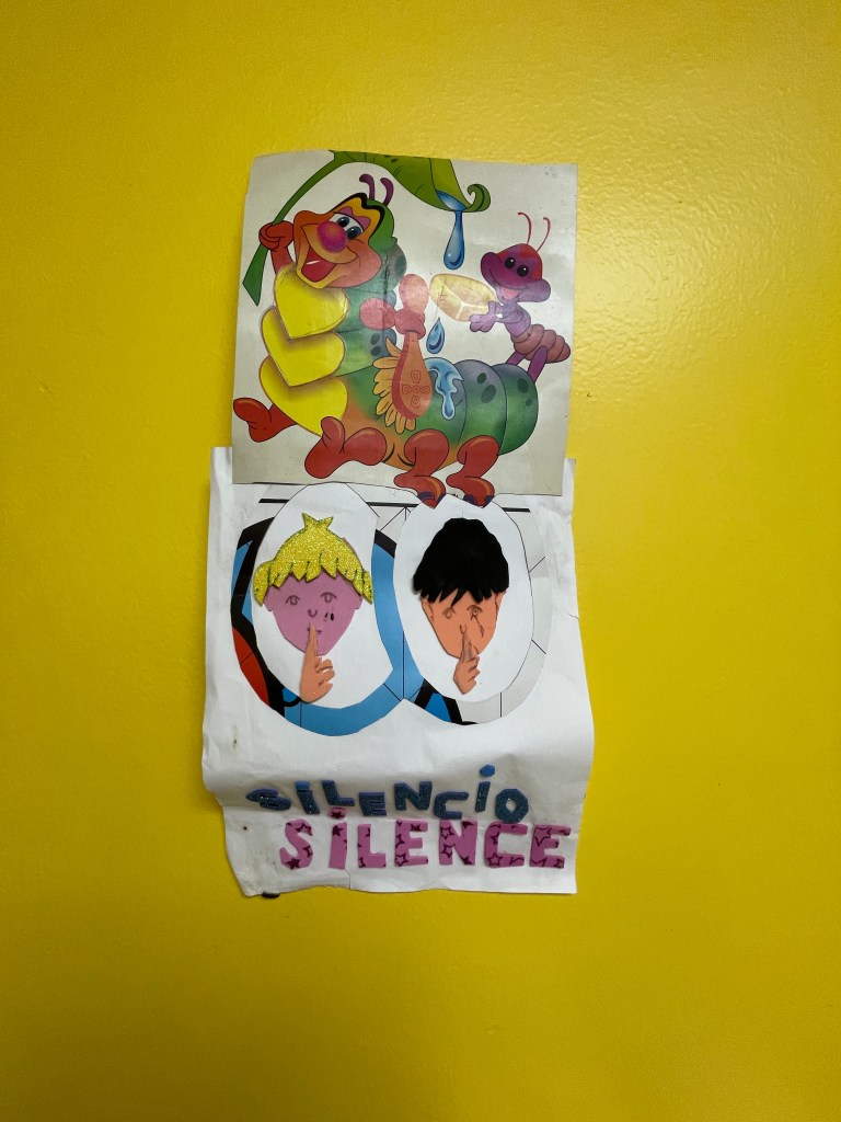 What I did see, though, was a struggling library. The entire space is just two large rooms. Adult books are in the main room, while the children’s books are in the second room. Long tables and piles of chairs are scattered throughout, which hints at potential community events. I saw books in English and Spanish and of course everything was organized in good ol’ Dewey Decimal. I had read that the Department of Culture is working to improve public libraries throughout the country. Hopefully, the program will make it to Bocas del Toro too. The top row of photos are of the first room and the second row are from the second room. Note the obligatory, but very cute, keep quiet sign.