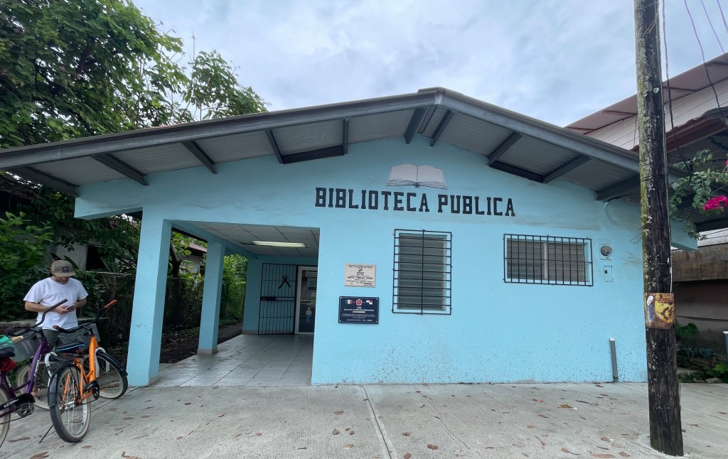 Once we arrived in Bocas del Toro and settled into our Bed & Breakfast, we headed into town to do some exploring. Besides getting lunch (more on that later), I had two primary goals: visit the local public library and exchange the book I had purchased in Costa Rica. The National Library of Panamá lists a branch in Bocas Town on their website and I was hoping to catch a glimpse of the interior. (Spoiler: we plan on visiting the National Library when we’re in Panamá City again before we head off to our next country.) We found it quite easily, since it’s very close to the main square/park in the heart of downtown. The building is a beautiful shade of blue that helps it stand out too.