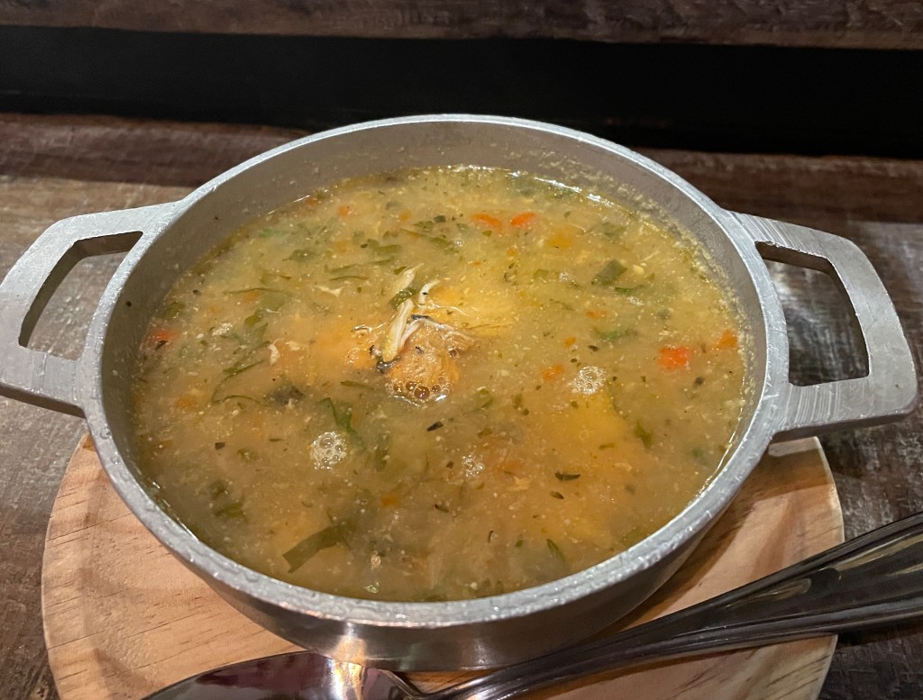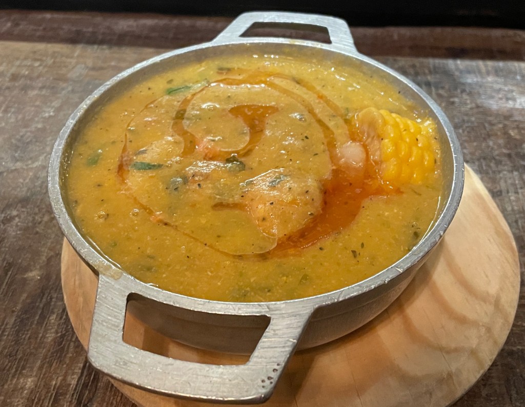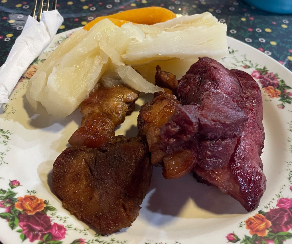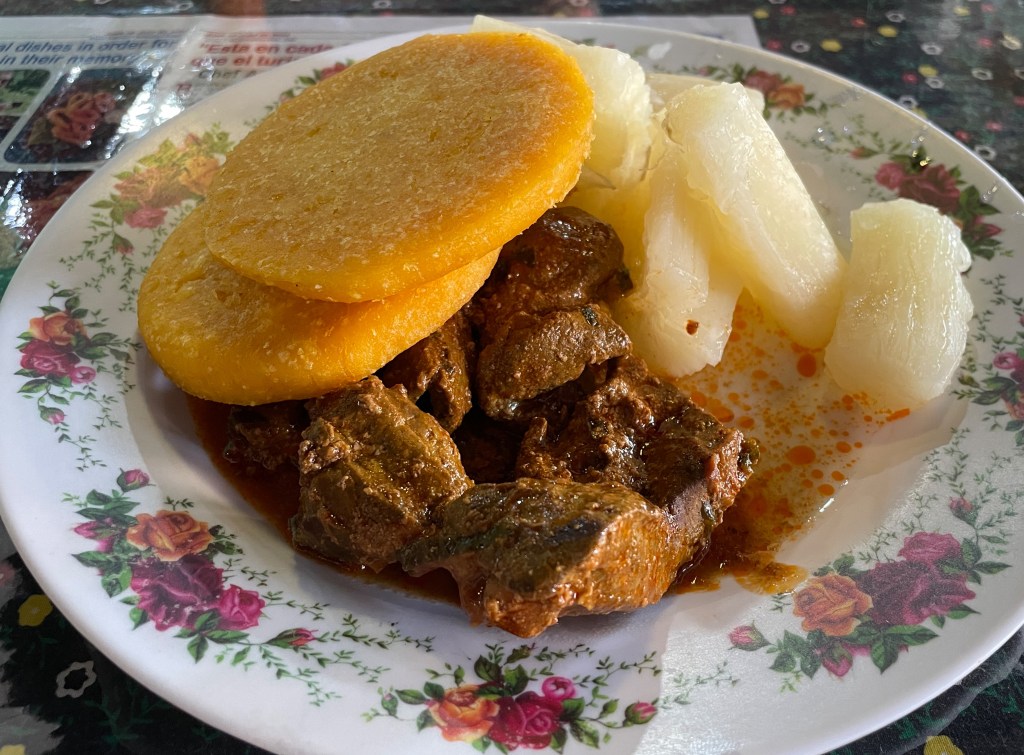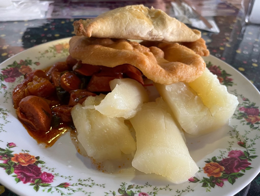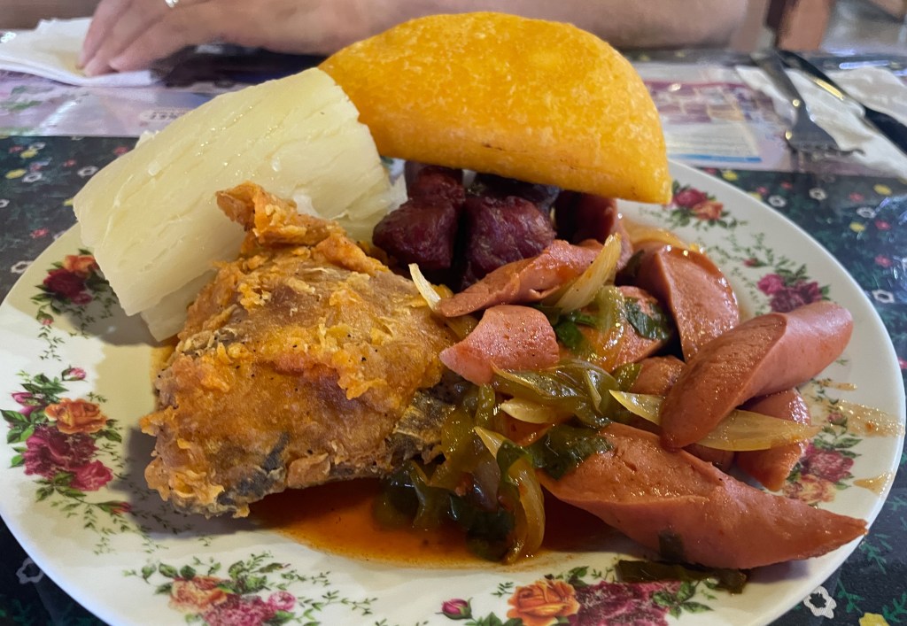 The second time we visited this cafeteria, we had many more choices. On the left is Adam’s plate: boiled yucca, salchipapas, fried chicken, fried pork, and a corn empanada. My plate was pretty basic: fried pork, boiled yucca, and an almojábano (a type of cornmeal fritter). This food kept us full for hours, which we needed for a long travel day.