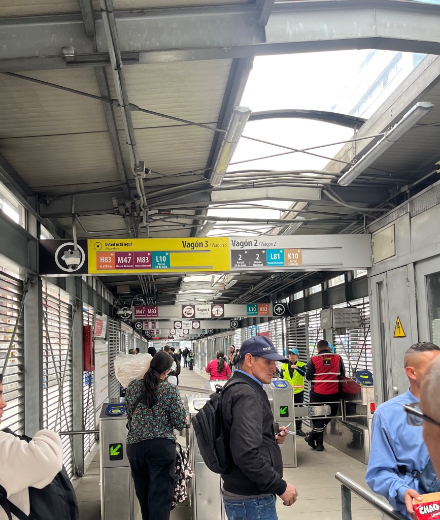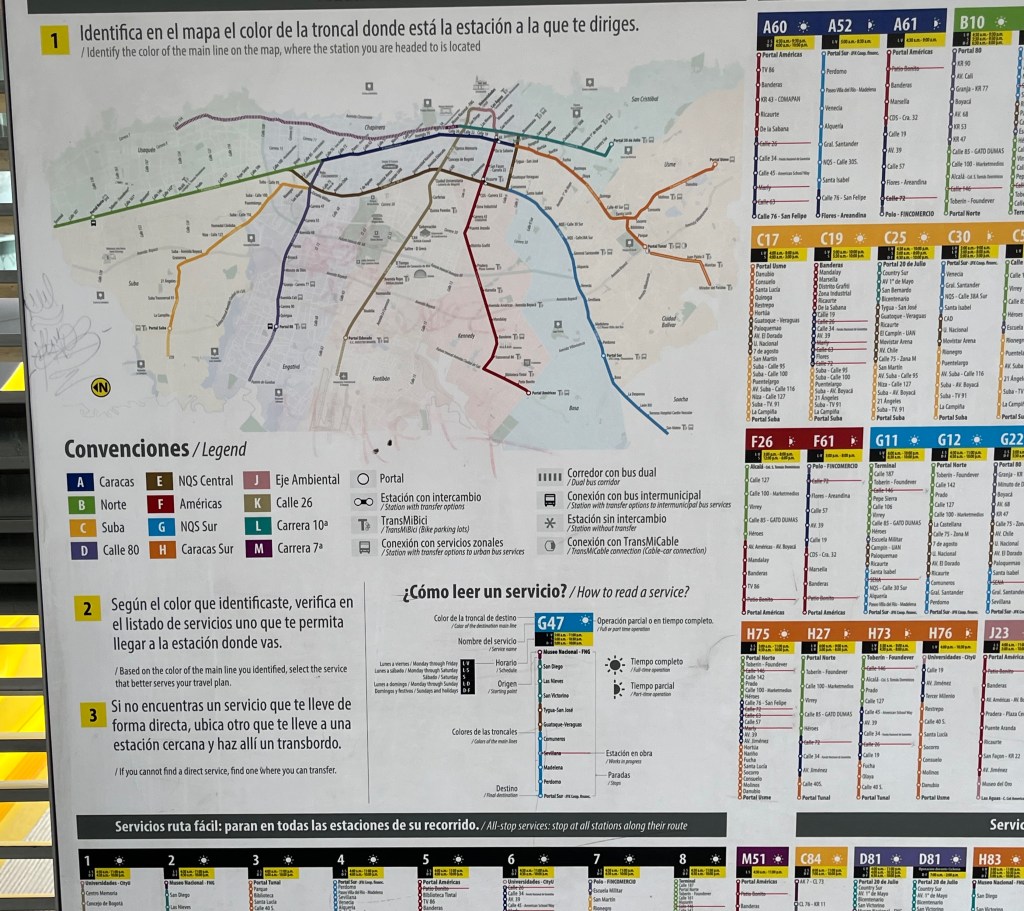 In the photo above, readers will note that certain letters correspond to specific portals or areas in the city. As an example, if you want to get to Suba, you need to eventually connect with buses that have a route number that starts with C. The confusing part of this system is while the portal letter doesn’t change depending on the cardinal direction one is going, the number, however, will change. Sticking with the Suba example: C27 will take you from Portal Usme in the east to Portal Suba in the west. However, if you want to go from Portal Suba in the west to Portal Usme in the east, you need a different C-bus.