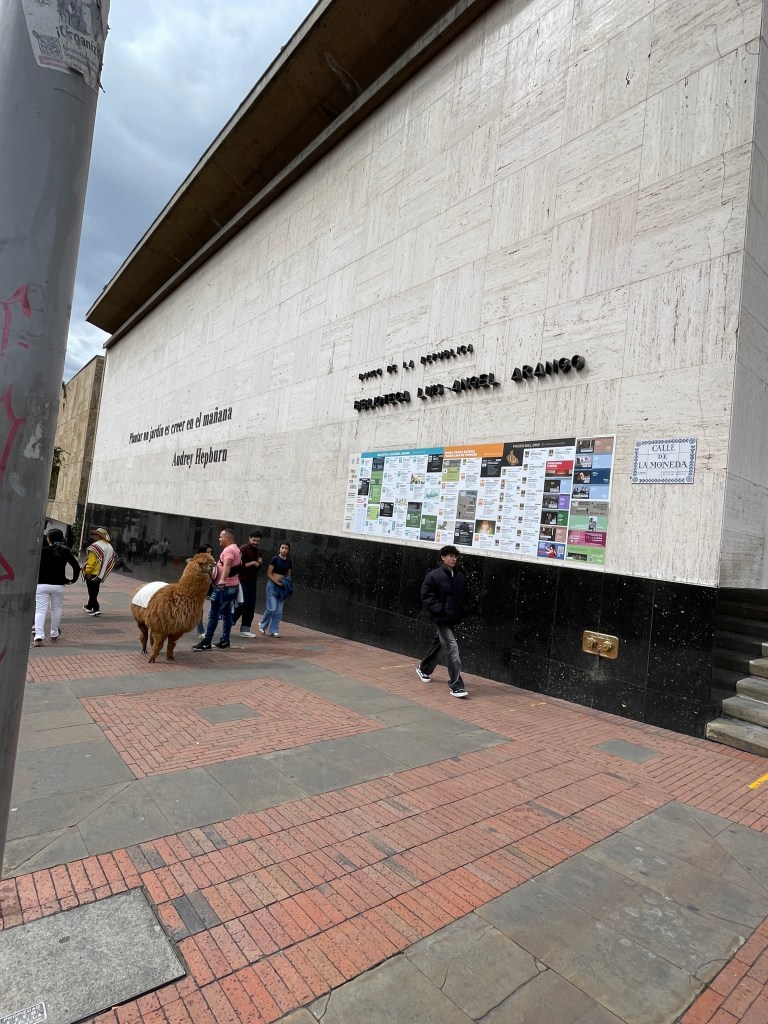 The other library we visited was the Biblioteca Luis Ángel Arango (Luis Ángel Arango Library) which we randomly stumbled upon on our way to the Plaza de Bolívar. What’s interesting about this library is that even though it is a public library, it is one of 24 libraries, museums, and cultural centers funded by the Banco de la República (Bank of the Republic). A separate government-funded public library system exists, but from what I could glean online, it is far less impressive in its resources. This particular branch is one of the most important libraries in Latin America because of the unique material it houses. If we had more free time in Bogotá, I would have liked to arrange for a tour. At any rate, here is a photo of the exterior, which was the only good photo I snapped. Yes, that is a llama in desperate need of a shear. It’s mostly to lure tourists to spend money for a photo opportunity. (We are in the Andes after all!)