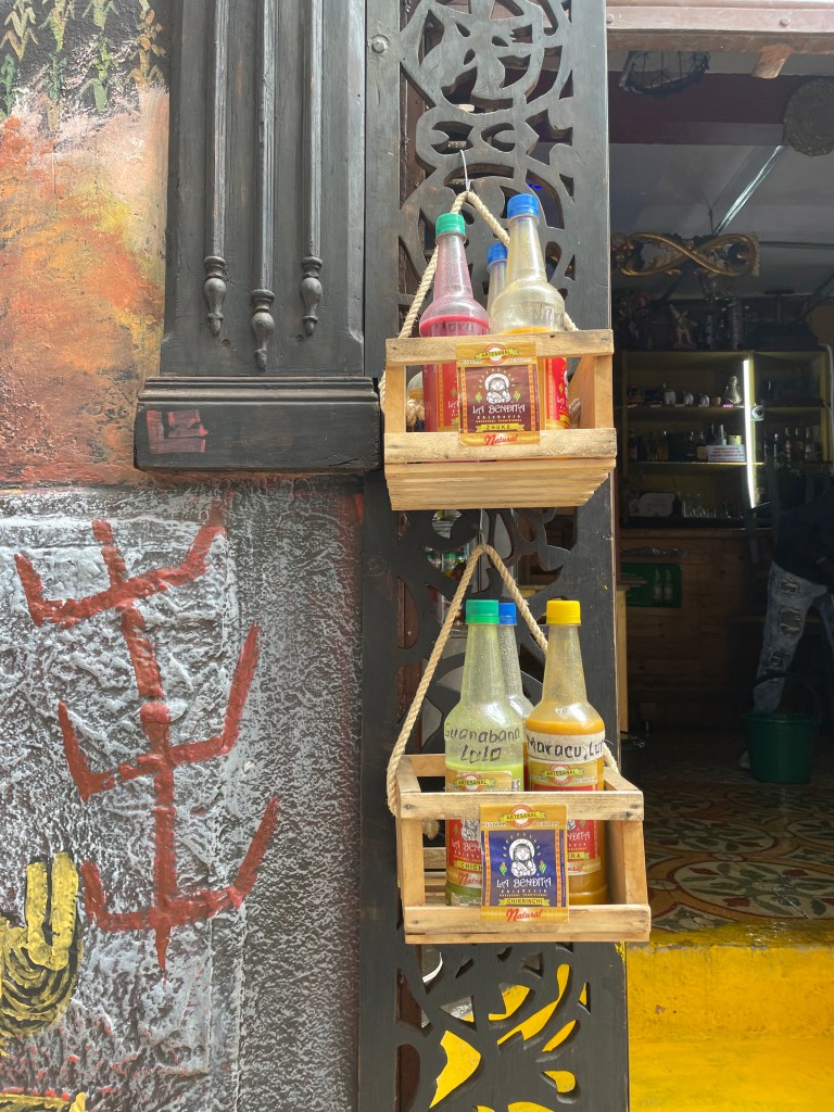 Another drink that is popular but controversial is called chicha. This fermented corn drink is, essentially, hooch sold on the street in plastic bottles. In the La Candelaria neighborhood near our hotel, vendors and restaurants offer free tastings to anyone who walks by and we saw people of all ages walking around with bottles. The drink is tart like kombucha, a little chunky, and flavored with different fruit such as grape, lulo, apple, and lemon. I was very excited to try it, but the kombucha of it all was too much for me. Adam liked it and eventually bought himself a little bottle of grape chicha to enjoy.