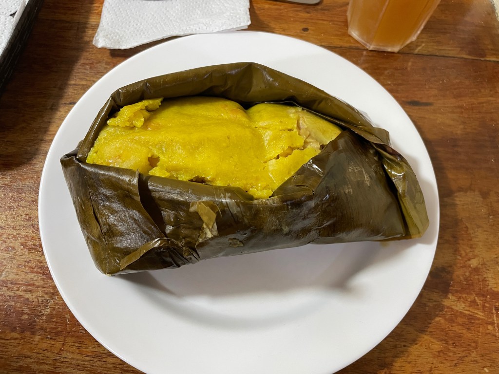As we sat down, we debated between ordering tamales or the sancocho, a classic Colombian stew with meat and potatoes. Many people around us ordered it and the bowls were gigantic (like extra-large Pho bowls in the States), served with a side of corn, avocado, and a sauce. This particular sancocho, though, is made with heavy cream so we opted for the tamales. Each tamale was huge and included a whole drumstick, pork belly, and a bit of veggies, wrapped up neatly in a banana leaf. The masa was exceptionally soft, full of flavor, and didn’t really need hot sauce. (Why do tamales get softer as we travel further south? I’m not complaining, just curious!) We were still a little peckish after we ate it, so we decided to order the longaniza, a popular sausage. It was full of flavor, had an excellent snap, and the hot sauce was one of the spicier I have eaten in Colombia. (Obviously I didn’t eat my share of the bread.) We also ordered a lemonade, not pictured, that was flavored with panela. Delicious.