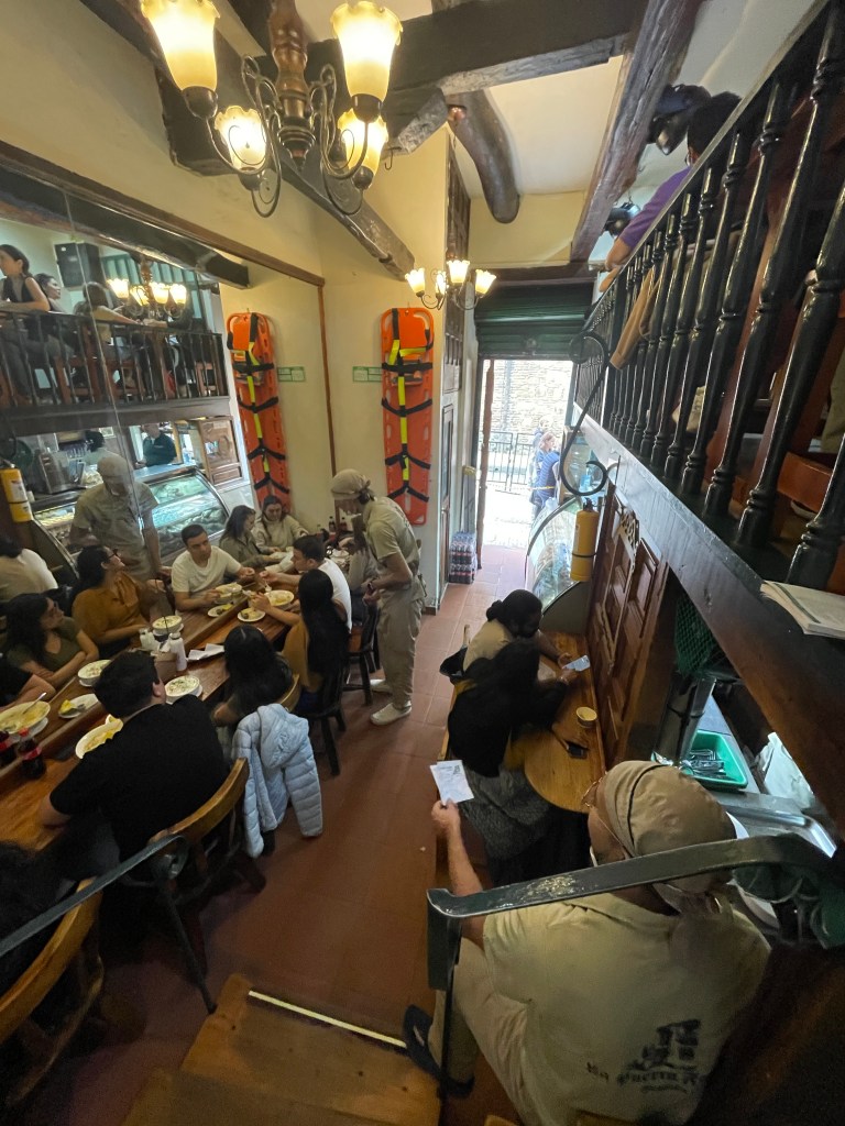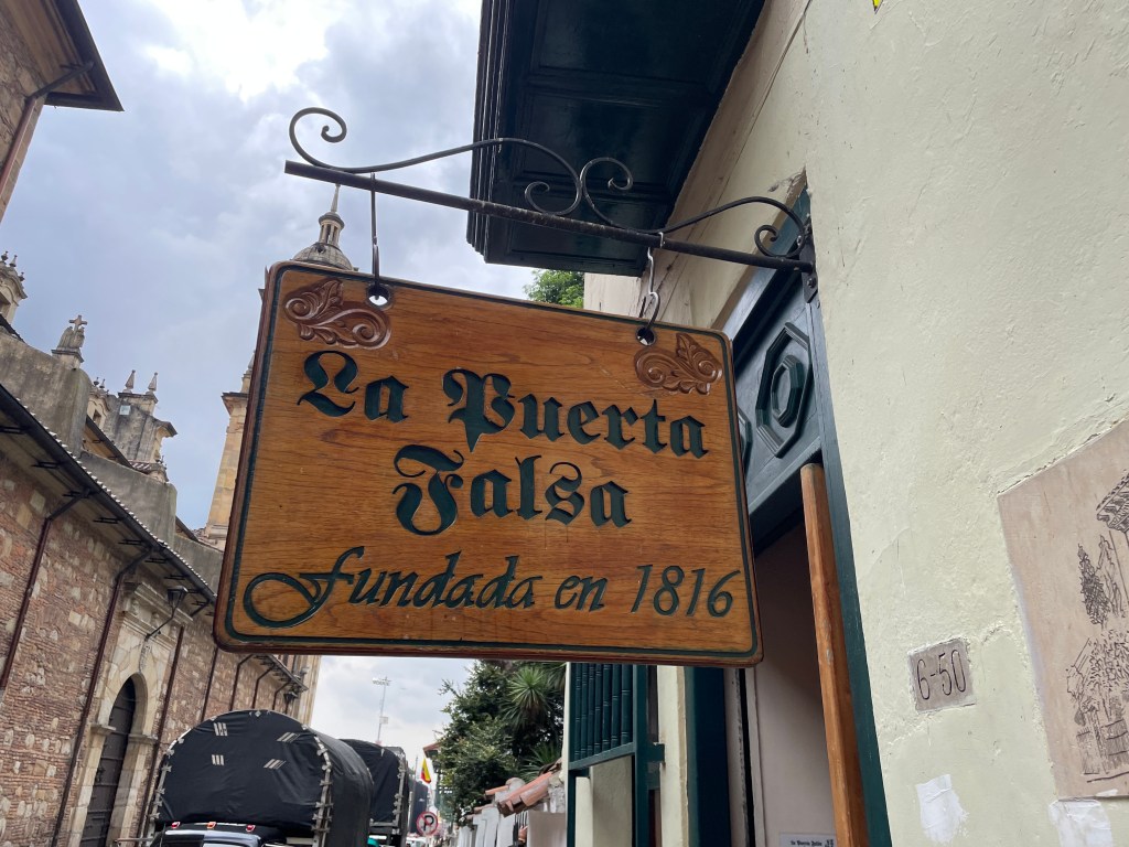 We didn’t only eat street food though. We chatted quite a bit with a very sweet server at a Georgian restaurant (the meal wasn’t anything special) who grilled us about what tipico (typical) Colombian food we had tried so far. When we mentioned we hadn’t had Colombian tamales yet, she insisted we visit La Puerta Falsa (The False Door). This itty-bitty restaurant has been around since 1816 and serves a very simple and affordable menu. Besides the good food, this restaurant also has celebrity clout: Pablo Escobar used to come here for lunch and sort out business deals. That’s according to our friendly server, though I couldn’t find any supporting evidence on the interwebs so take it with a grain of salt.