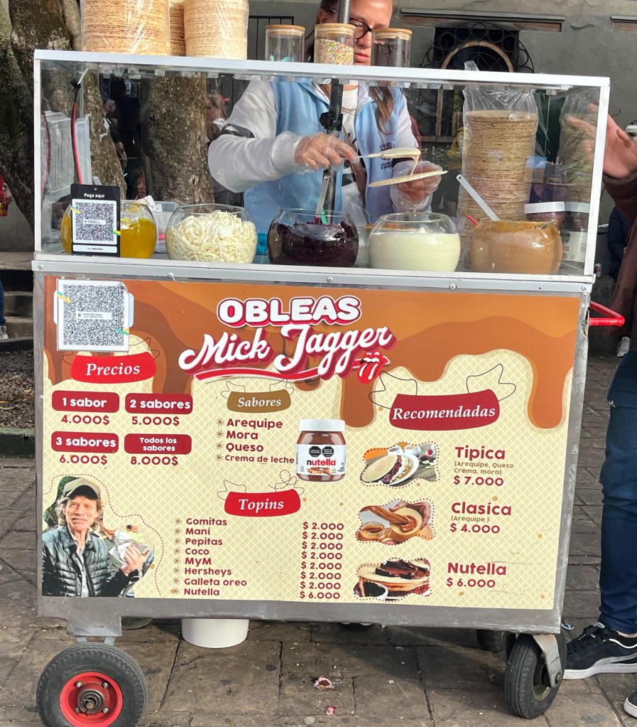Street food is everywhere in Bogotá, especially since it seems like everyone is always on the go. One of the foods we had heard of were obleas: two big wafers stuffed with a variety of sweet sauces and toppings. In 2016, the Rolling Stones played a show in Bogotá and someone took Mick Jagger to an oblea stand. Of course folks went gaga over it and now his face is plastered all over these stands. Adam had two on two separate occasions. The first was with dulce de leche, mora (blackberry), and condensed milk. The second time he ate it with dulce de leche, mora, nutella, maracuyá, and coconut flakes. If I could eat obleas, I would get one with dulce de leche, coconut flakes and either peanuts or chocolate chips. A girl can dream.