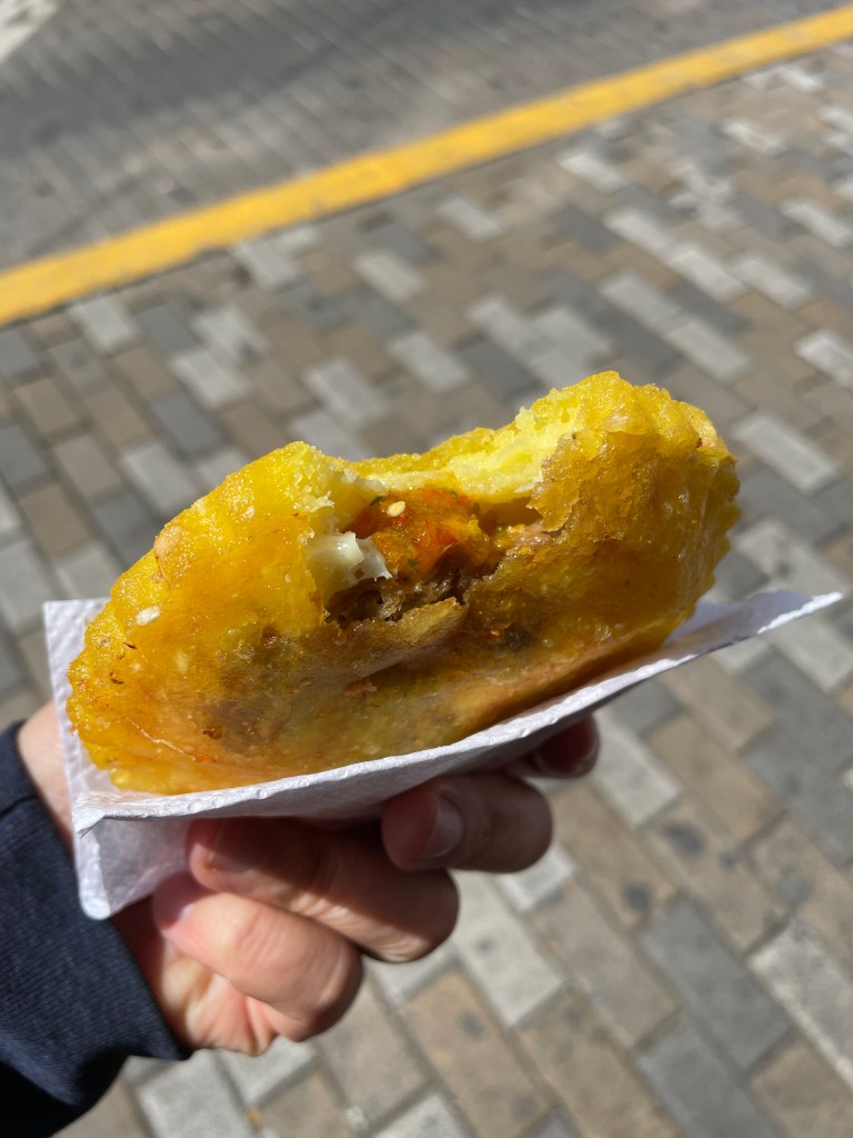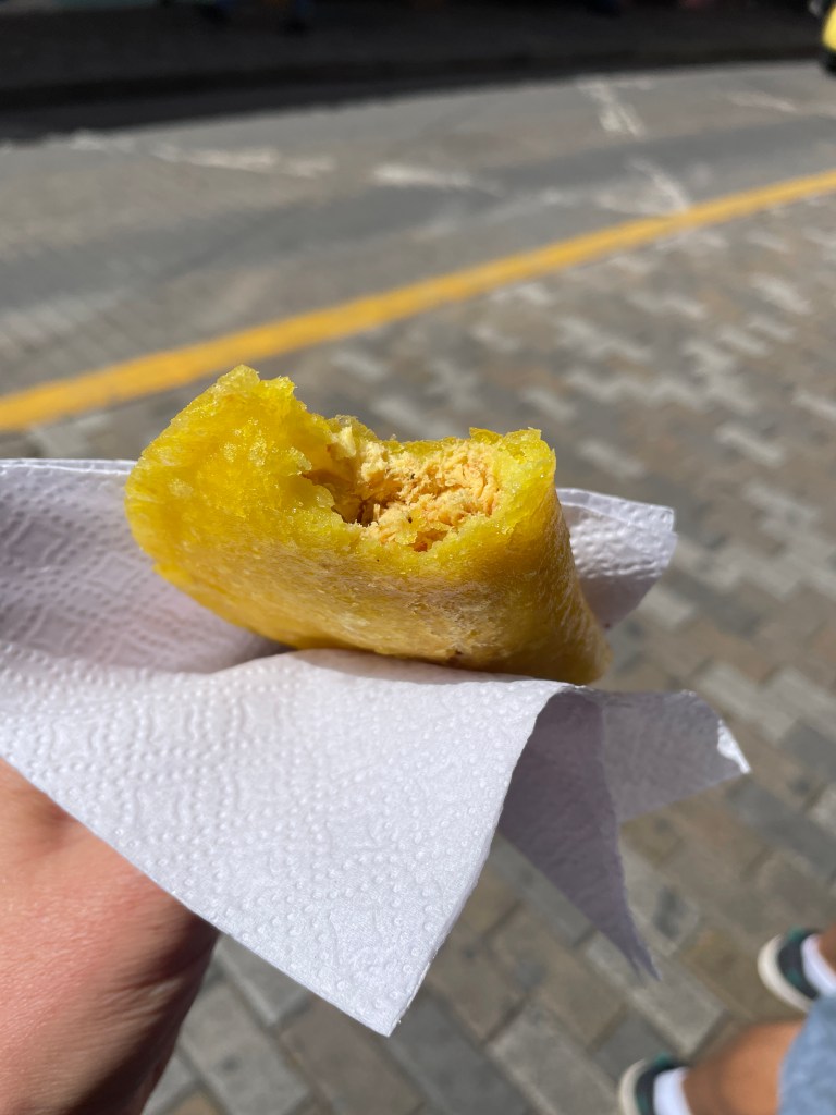 There is plenty of street food I can eat though! Around the corner from our hotel is a lady who sells all sorts of arepas. The first I tried was beef with egg (first photo on the left). The first bite was just greasy corn, but the second bite melted in my mouth. The beef is slow-cooked and whole egg is fried in the arepa. A few sauces are available to enhance the flavor too. Everyone else raved about the garlic aioli, which was good, but the spicy aji won me over (middle photo). The second was filled with chicken that was so well spiced I almost didn’t need the hot sauce, but I added some anyway. A warning: if you find good street arepas, be careful because you will dream about them and want to eat a million of them all day. I had to resist stopping at every arepa stand we passed by every time we went outside.