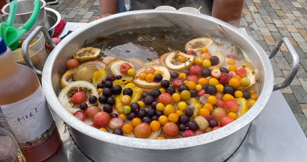 Folks sell all kinds of drinks on the street too. One of the fun ones is aromática, which is sort of a catch-all phrase for a hot fruity drink with or without alcohol. Look at all those beautiful fruits in the pot just simmering away on the photo on the left! She asked us if we wanted it sweetened with panela (claro, of course) and with our choice of alcohol (rum, claro). It’s a perfect cup on an especially cold day.