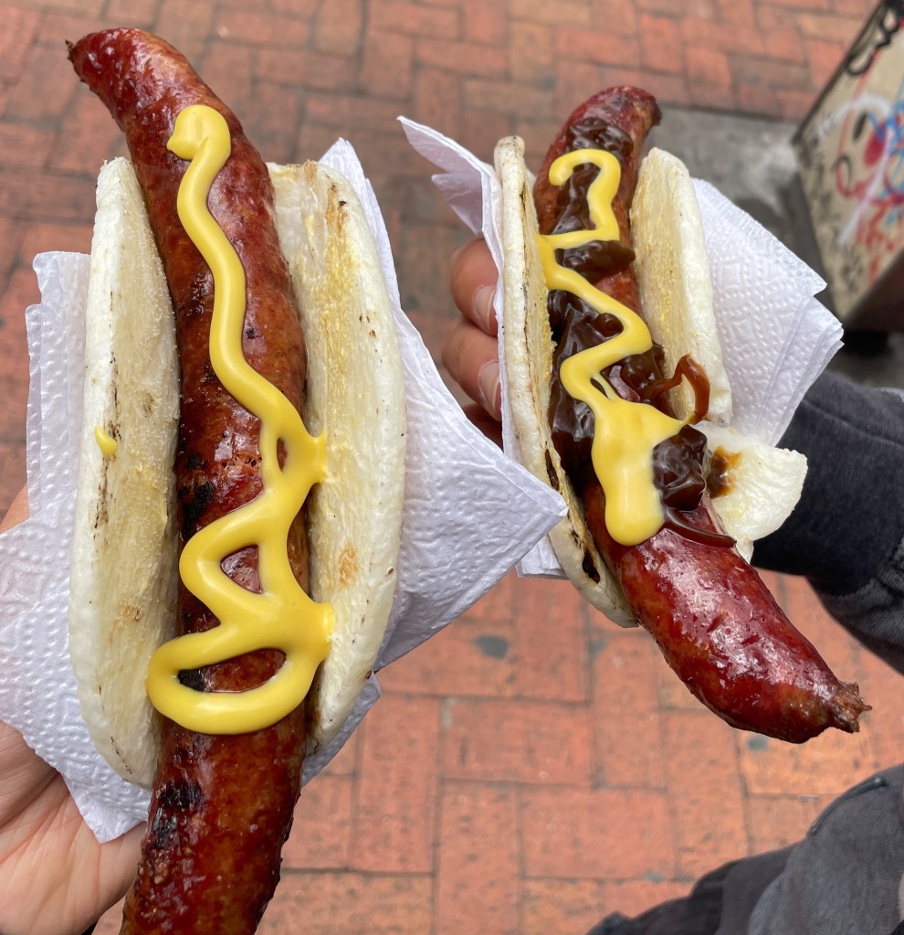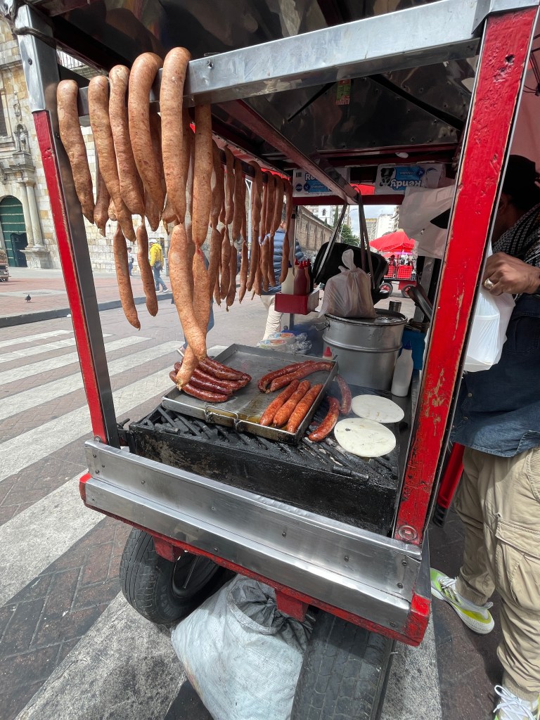 Arepas are more than just for stuffing though; they’re often used like tortillas, like at this chorizo stand. Is this a perfect substitute for a hot dog bun? Not necessarily, but it makes me wonder why hot dog stands don’t offer corn tortillas as a gluten-free substitute. The chorizo itself did not taste like Mexican chorizo at all, by the way. It was more like a thin, very porky bratwurst with an excellent snap. The mustard tasted more like yellow mayo and Adam said the barbecue sauce was very sweet without any smokey flavor. Still, for 5,000 COP (that’s about $1.50), who the heck am I to complain? (These are also addicting. Be careful out there y’all.)
