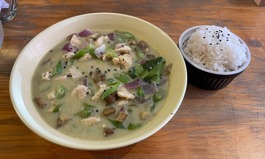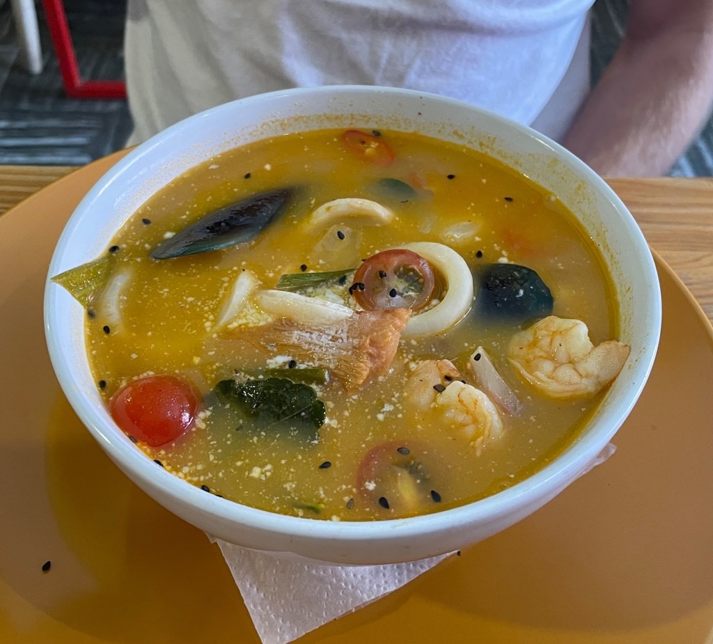 Lastly, I want to share a particularly delicious meal we ate while walking around the La Macarena neighborhood. Of all the non-Colombian meals we ate, this was by far our favorite. We stumbled upon Bangkok and it was the best Thai food we have had outside of Los Angeles. (L.A.’s Thai Town is world renowned for its cuisine.) Adam ordered handmade dumplings filled with pork served with a red wine-plum sauce as well as the seafood Tom Kha (left and center photos). I ordered the green curry with chicken, Thai eggplant, and red onion (right photo). Both of our mains may look watery but they were anything but that. The Tom Kha was very lemongrass-forward with a mild seafood undertone and the chilis grew in strength as Adam dug into the bowl. My curry was full of fresh herbs, the perfect level of heat, and the coconut milk was not too overpowering. The food did take a while to come out, but then we realized it was because the server-chef-owner made everything to order from scratch. Since the restaurant is new, he is doing everything himself and we were very impressed.