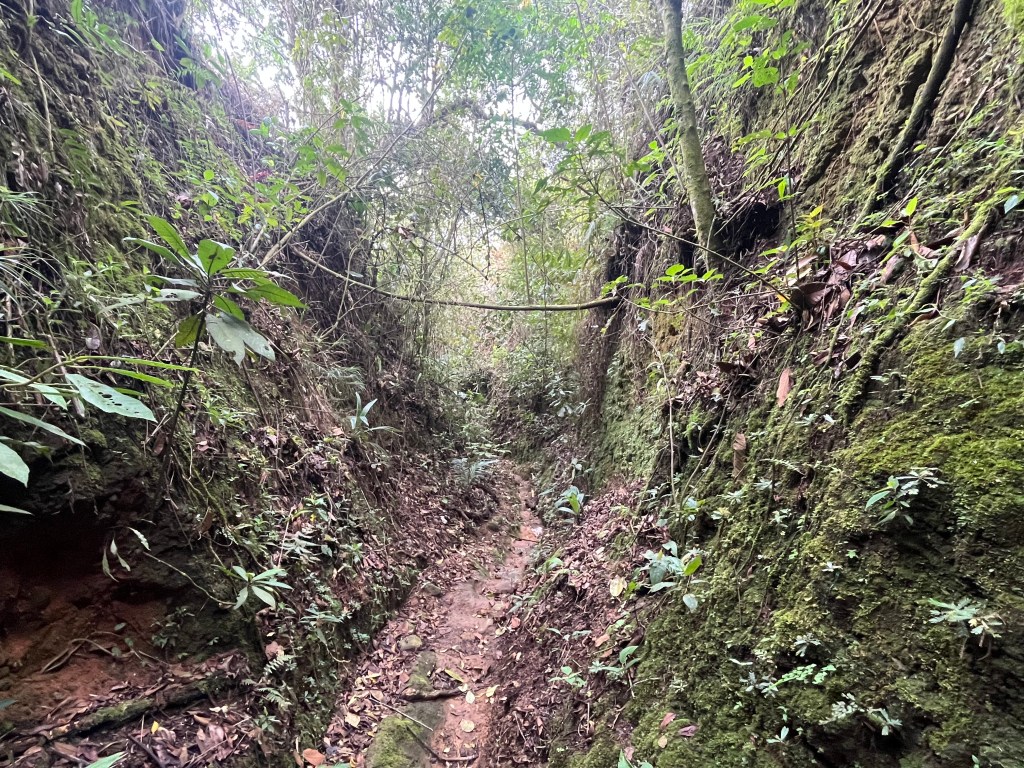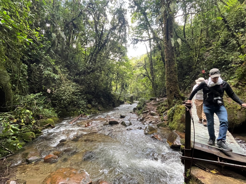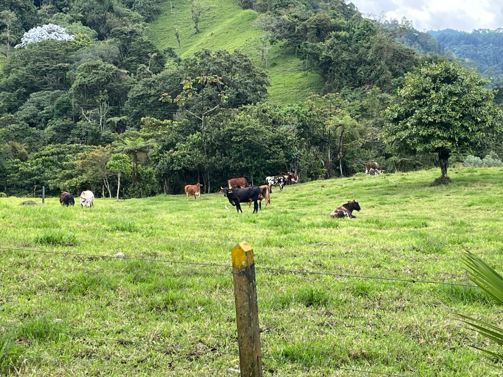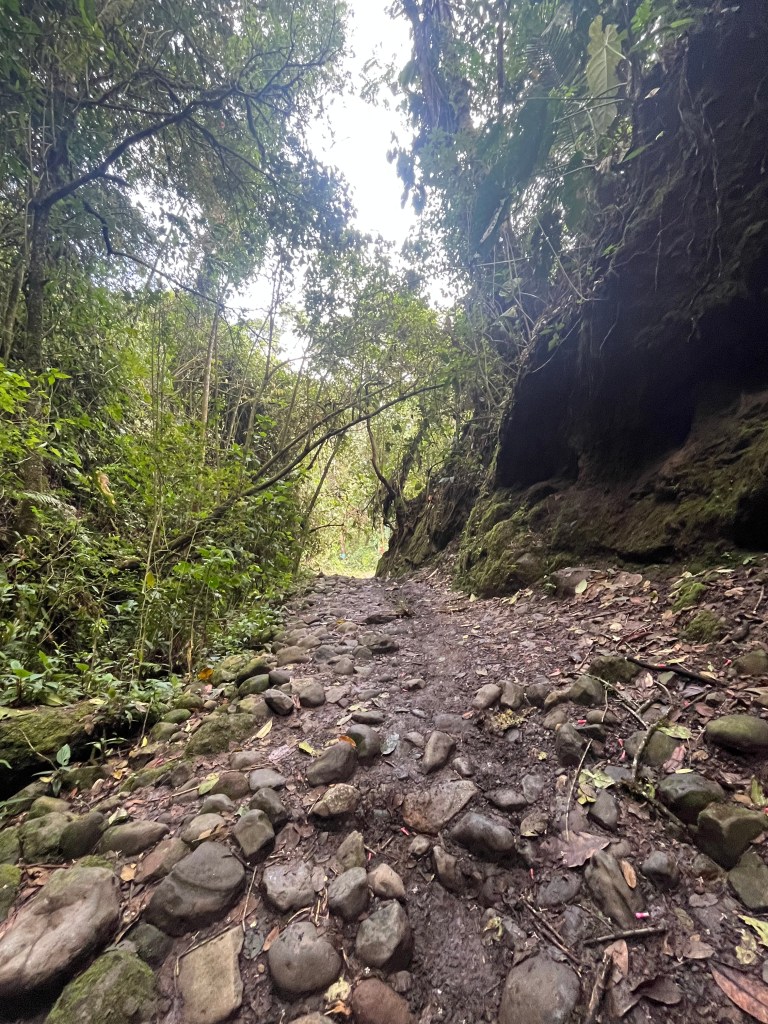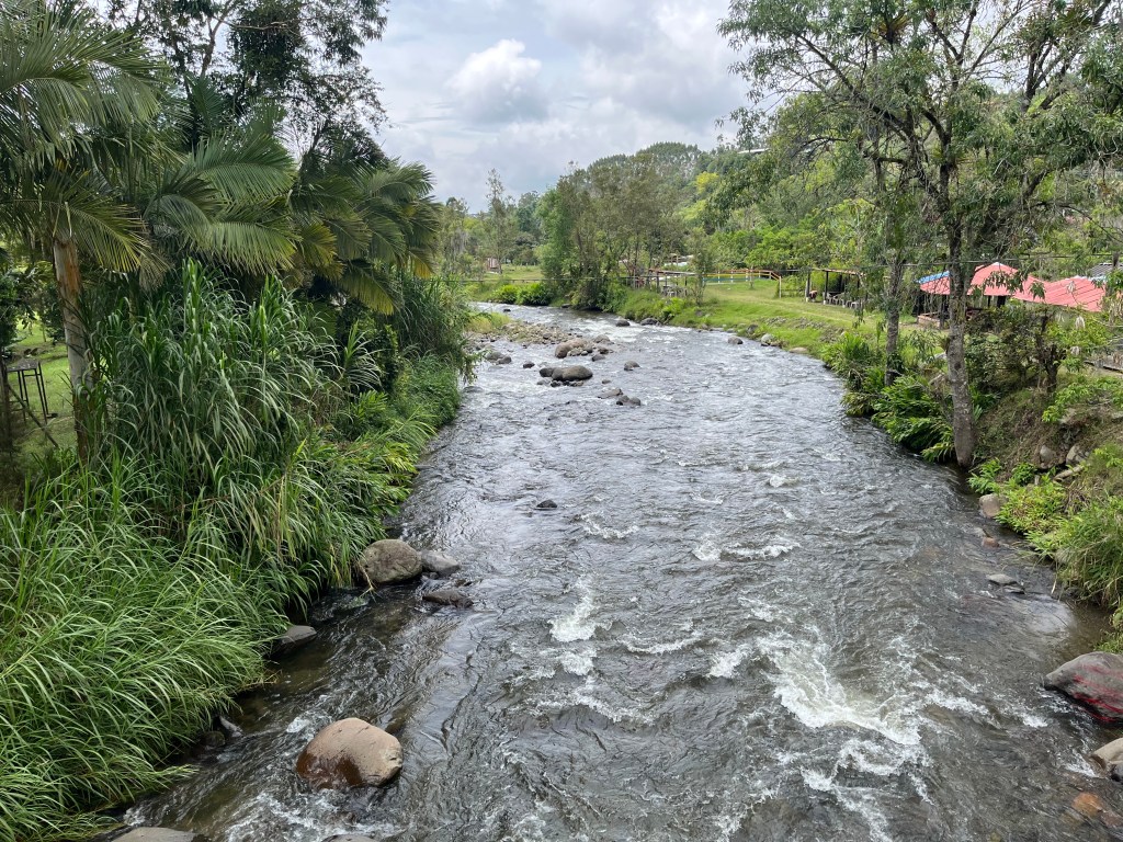 The mixture of working dogs barking, people working on their fincas, and Andean bird life is an interesting blend of sounds. Once we got to the road we stayed to one side and took it to the entrance to the trailhead. This part of the journey was also a bit daunting as this road is a major route between Armenia and Salento and quite well-traveled by motorcycles, cars, trucks, etc. When we arrived at the aforementioned entry point, it was still another 15 minutes of hiking and climbing to get to the main entry gate. As we hiked along, the Quindío River winded alongside us. As we started approaching cattle pastures we saw the official entrance gates to the waterfall trail. There we paid for entry and started the relatively short (less than a mile) hike to the waterfall. The hike to get to this entry gate took us longer and had us covering more distance than the trail itself.