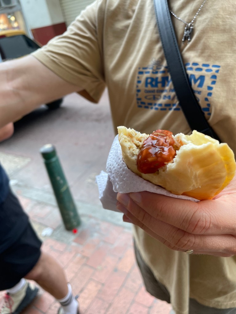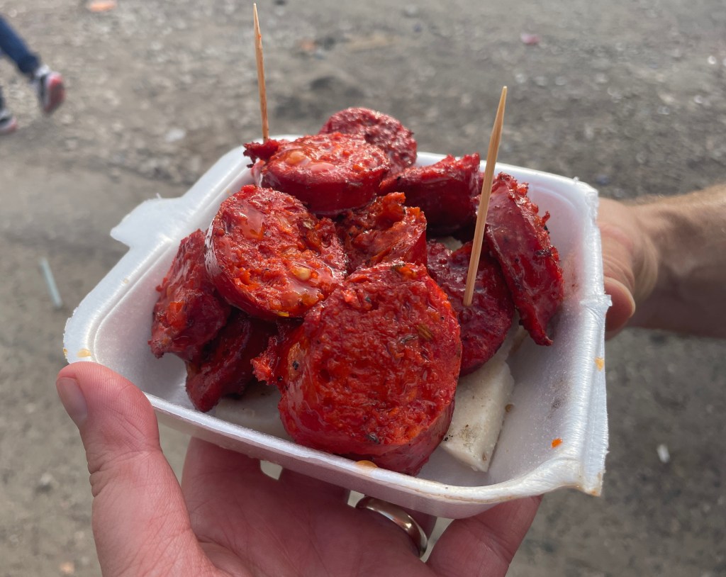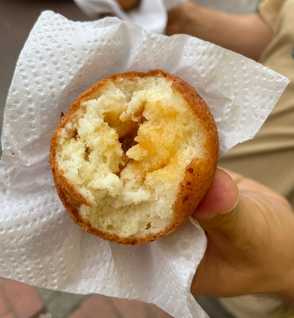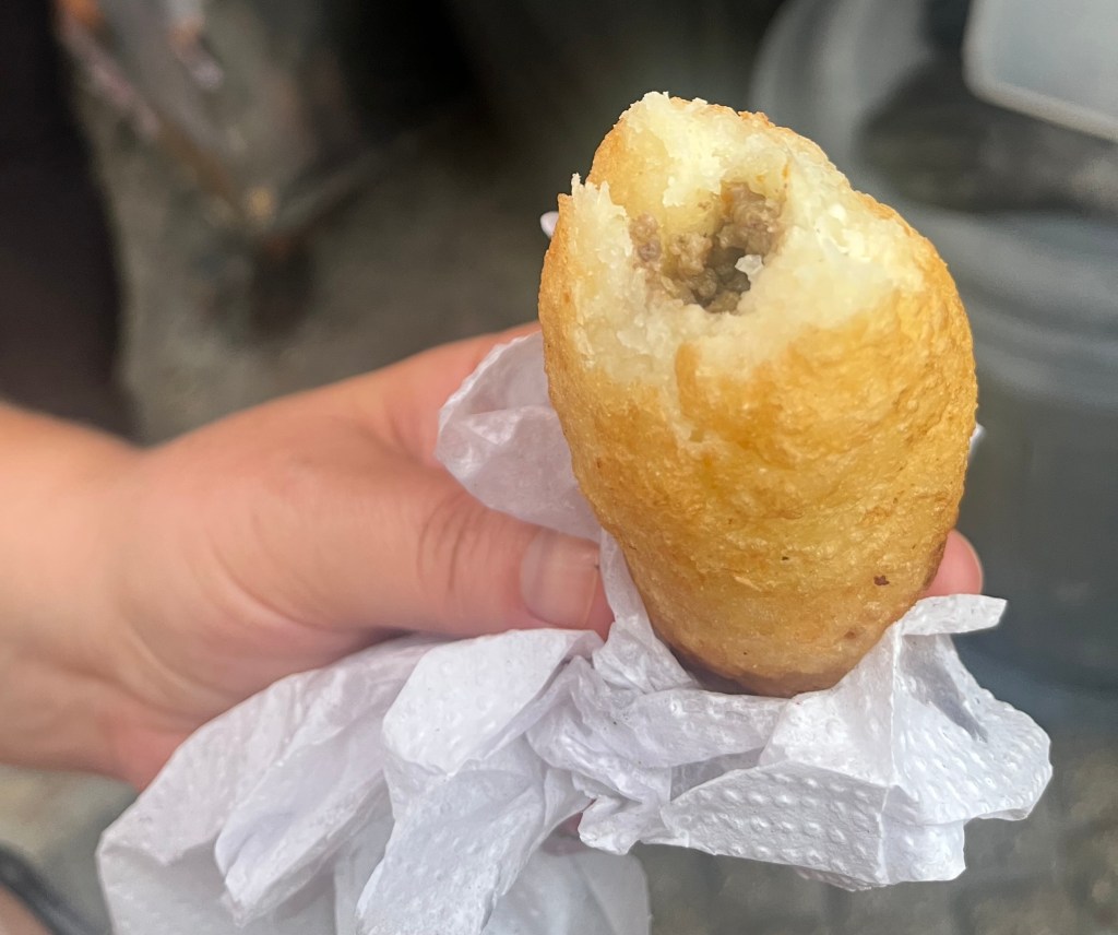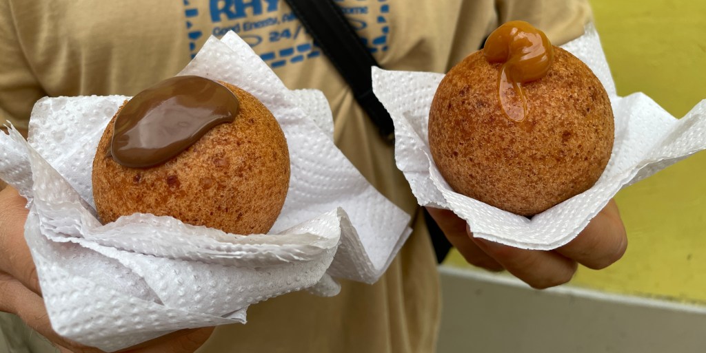 Colombians don’t just eat savory street food, though. Since Medellín, I had been asking Adam to try a buñuelo, a fried yeast dough stuffed with all kinds of sweet fillings. Every time I saw a stand, they were stuffed with a sweet cheese, which was a no-go for him. In Cartagena, we randomly stumbled upon a place that stuffed them with caramel and chocolate (left and center). According to Adam, the dough is like a cakey donut rather than a donut texture and he enjoyed the caramel-stuffed one better. In typical Adam fashion, he had to chase that sweetness with a chicken empanada topped with a goopy sweet chili sauce (right).