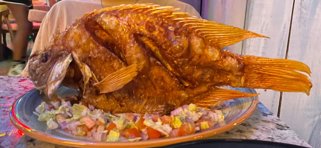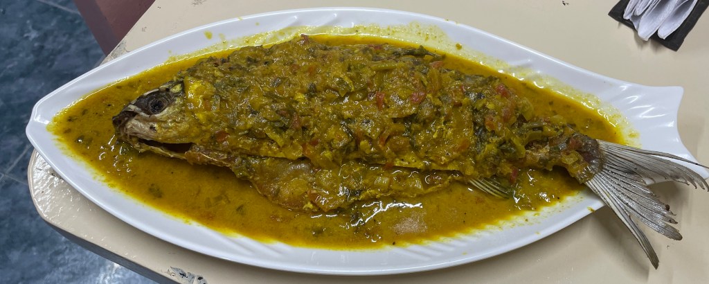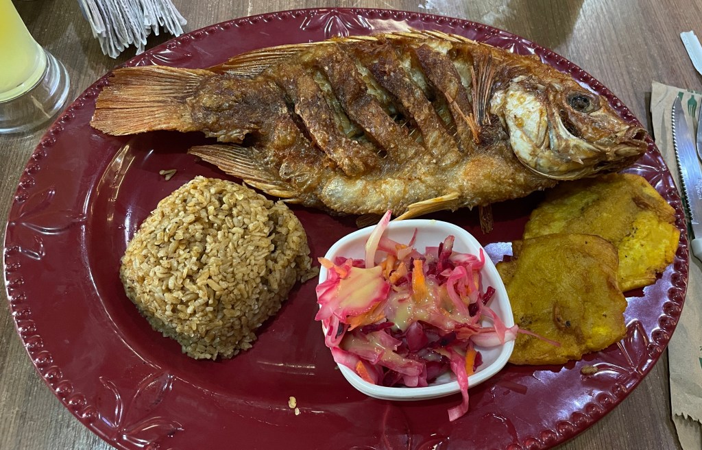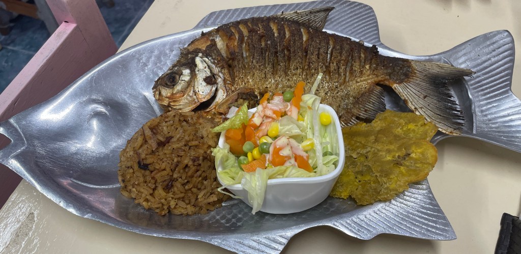 As yummy as the Vietnamese food was, the two best meals we had in Medellín were at Afro-Colombian restaurants. One focused on food from the Pacific side and the other from the Caribbean. Readers might be surprised to learn there is a large Afro-Colombian presence on the western/Pacific side of Colombia, but it’s actually larger than the communities along the Caribbean. Sadly, I don’t have photos of the Pacific Afro-Colombian meal because my expectations were so low by that point I didn’t bother taking photos. It was scrumptious though. At El Fogón Costeño, the Caribbean restaurant, we had a chance to try two new fish. I ordered the bocachico (farm raised) in a tomato-onion stew (left) and Adam ordered the fried cachama (right), both of which are river fish. The bocachico had a mild river taste and heaps of bones, so I wouldn’t recommend it if you’re not a patient fish eater. The cachama was mild-tasting and not too boney, but small.