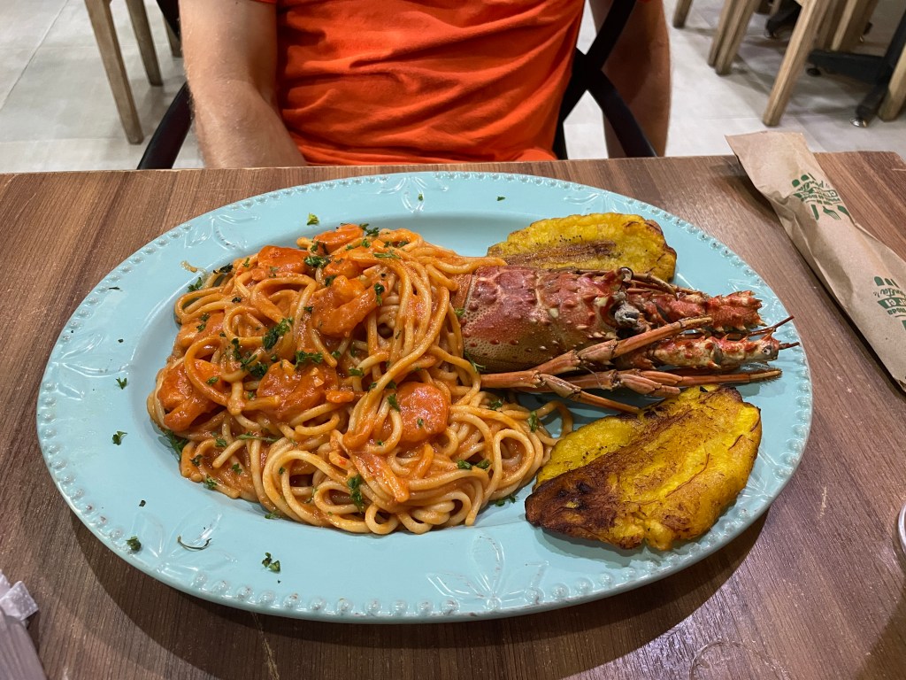 We don’t order it as much because we try to limit our fried food consumption, but probably our favorite thing to eat in all of Colombia is whole fried trout. It never lets us down. Just look at the left and center photos. The exterior is crispy, the meat is soft, and it’s easy to pick around the bones. Sometimes, though, it’s so tempting to get other kinds of seafood. The photo on the right is a shrimp and lobster dish Adam ordered at a restaurant. It came with a whole lobster! He said it was delicious.