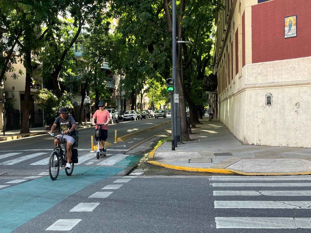 From left to right: scooter and bike riders along a Buenos Aires street; a closeup of a bike lane