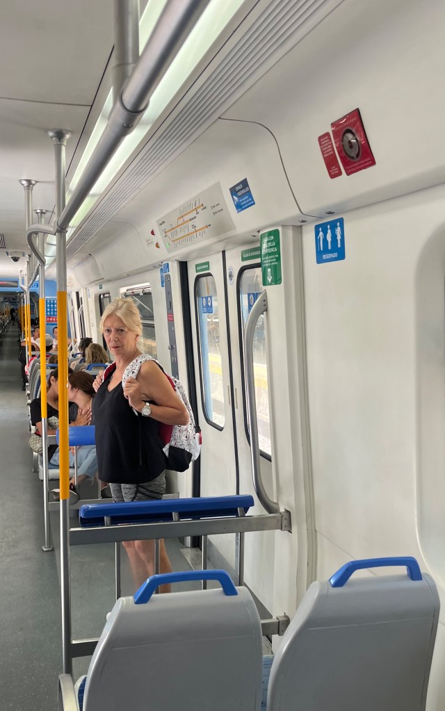 Left to right: inside a train; train cars feature a map with lights that indicate when a stop is upcoming and which stops have already been reached similar to those I saw inside subways in Rio de Janeiro, Brazil