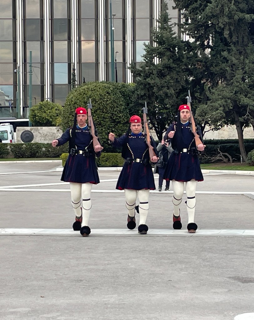 As we were exploring the city, we had a chance to see the Change of the Guard outside of the Hellenic Parliament. The ceremony takes place every hour on the hour, so it’s easy to stumble upon it. These specific soldiers are called Evzones and they guard the Tomb of the Unknown Soldier, which remembers all fallen Greek soldiers. The area itself is politically charged, not only because it’s in front of Parliament and the site for national commemorations. But also because across the street is Syntagma Square, a popular place for protests. Our taxi driver from the airport told us that the government knows they’re doing a good job if people are enjoying their time in Syntagma Square.