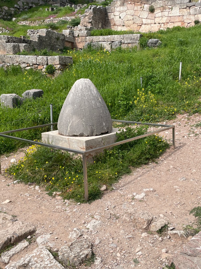Middle row: various ruins from temples and treasuries; the right photo is of the “belly button” that is supposed to represent the center of the world and is always connected to a temple dedicated to Zeus