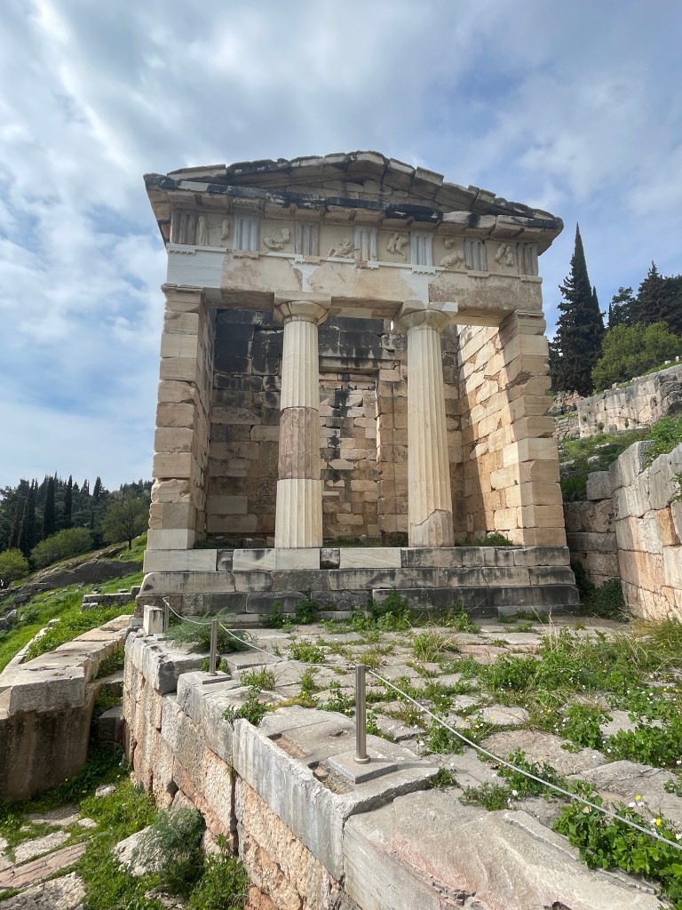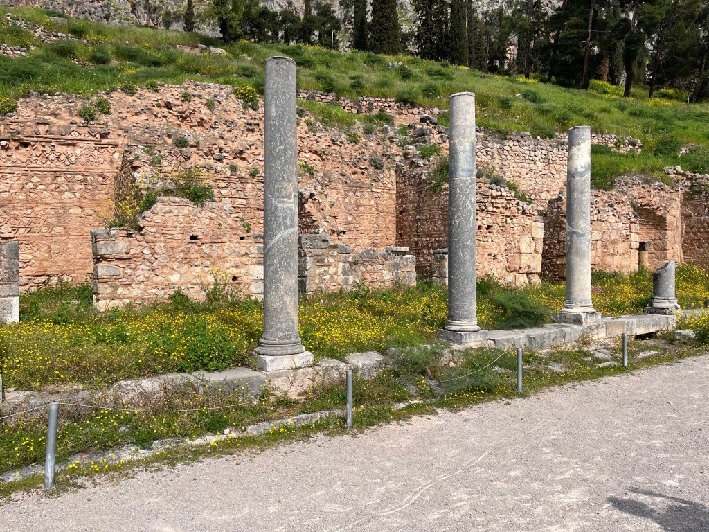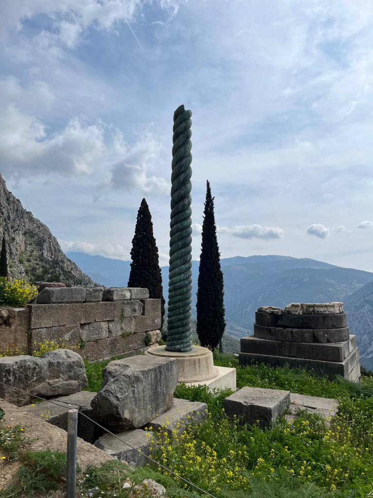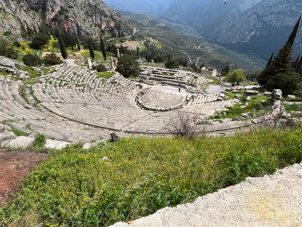 Bottom row, left to right: writing that was carved into the walls of the treasury to document how much money city-states donated to the oracle; a spire that were snakes coiled around each other, but the heads broke off; a view from above of the theater (because people always need entertainment)