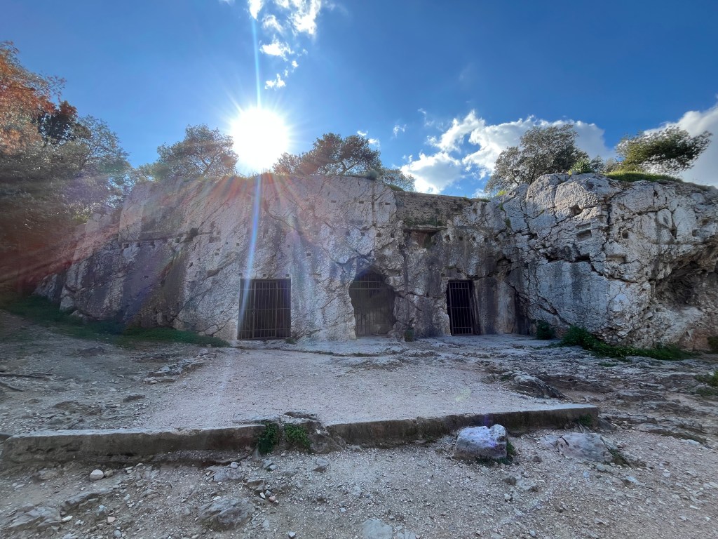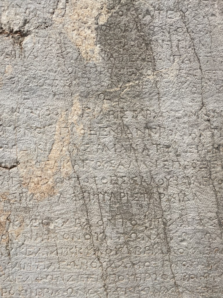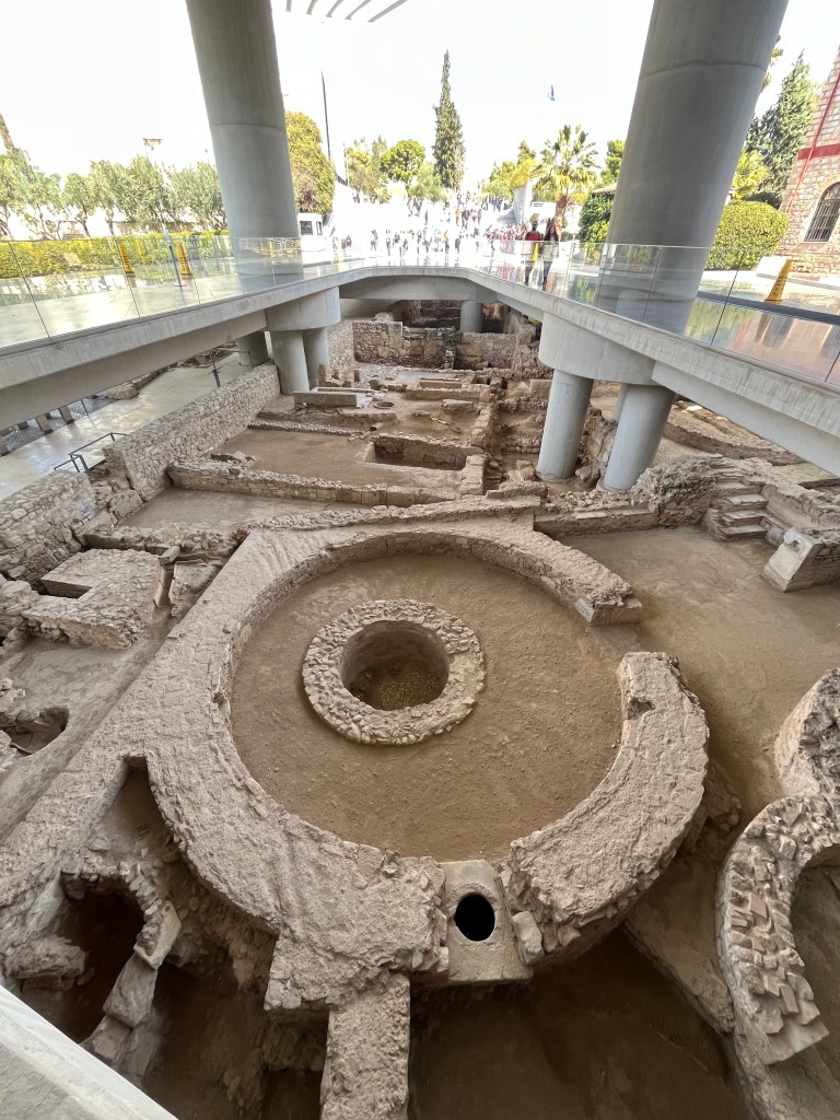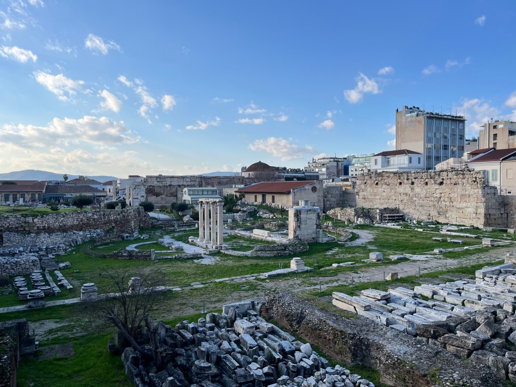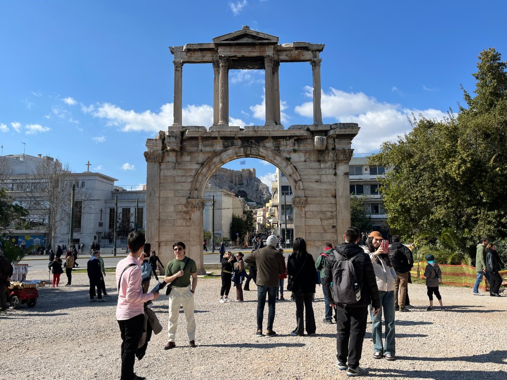 We walked by and photographed a few other famous historical points: the Arch of Hadrian, Socrates‘s prison (which was not his actual prison but is still remembered as such), and the Agora. (Photographed below, left to right.) Many historical sites are simply part of the background of Athens, making it easy to access and experience. We also noticed that many of the plaques provide a lot more information than we anticipated.