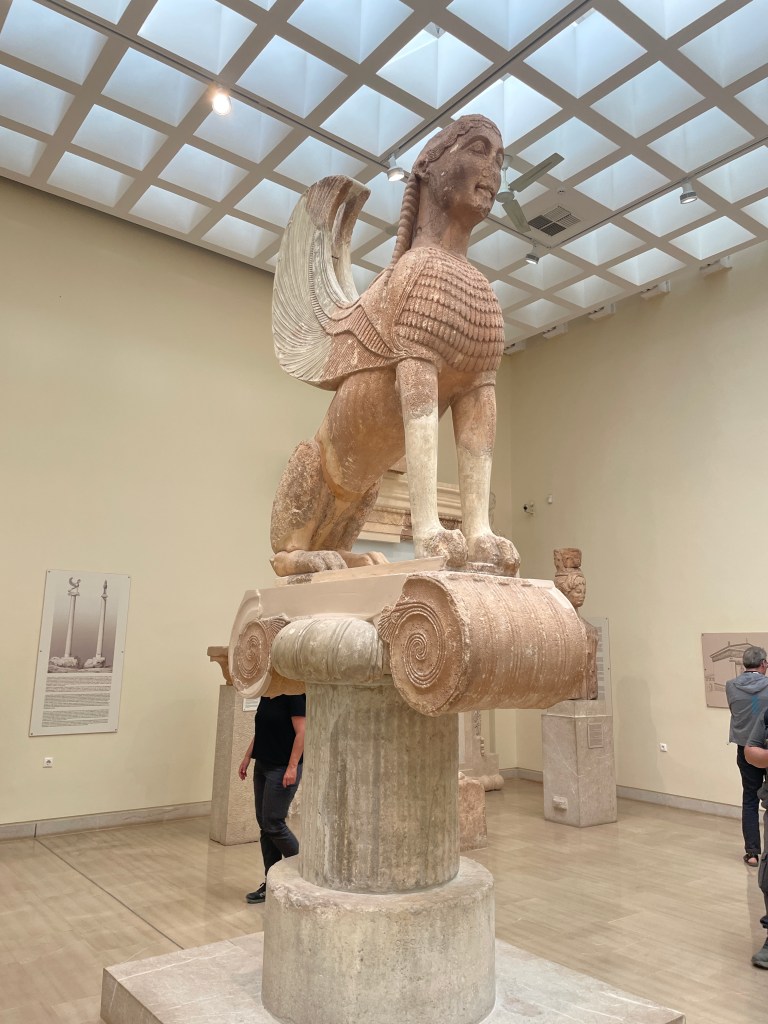 Top row, left to right: a sphinx (which contrary to popular belief is not just Egyptian, but present in many Mediterranean cultures); two kouroi statues that were common in Ancient Greece (learn more about them here)