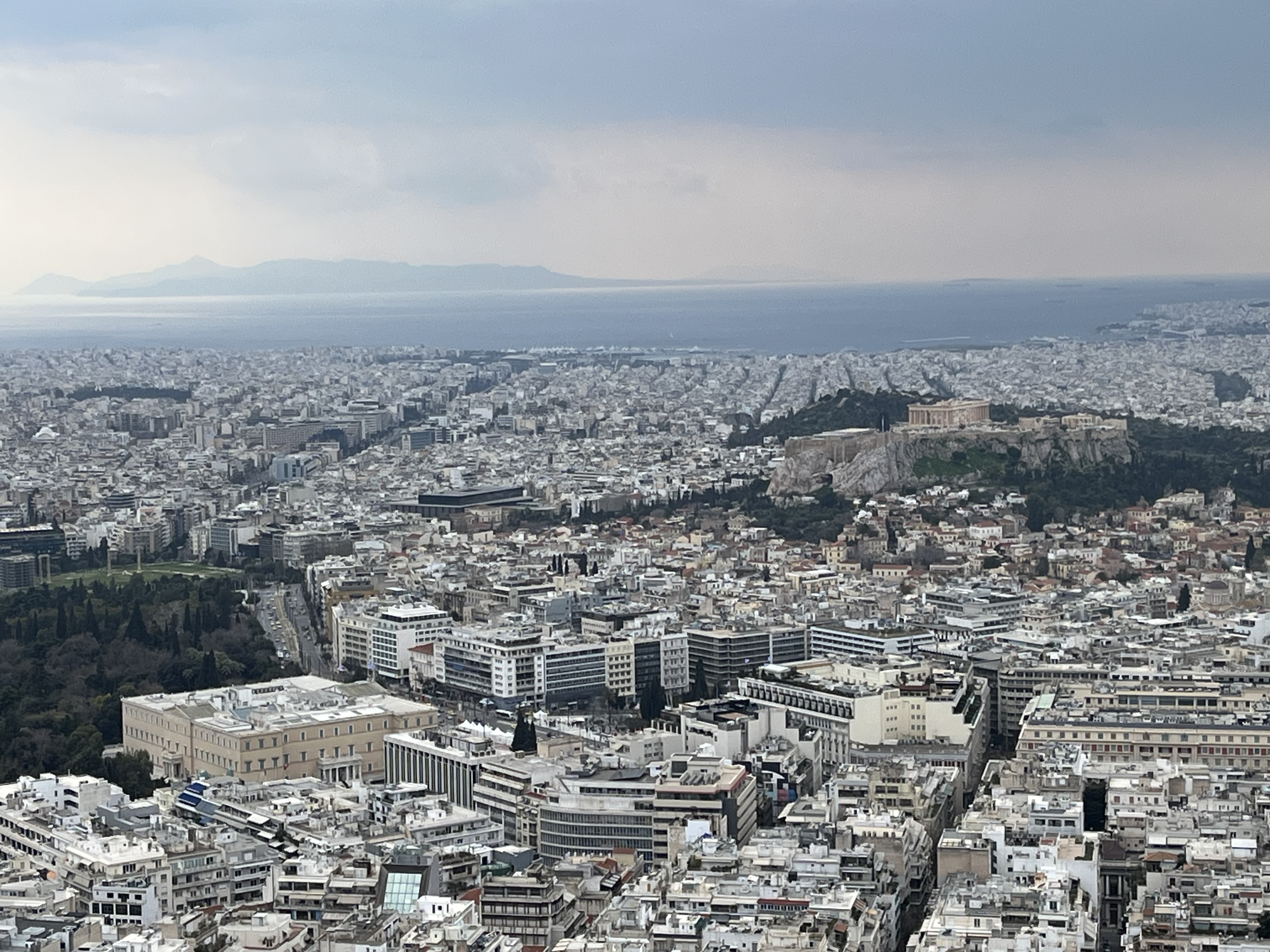In this photo from a lookout, you can see the Acropolis, which is the citadel that sits on top of a hill. The Parthenon is the building with the tall columns and is part of the Acropolis.