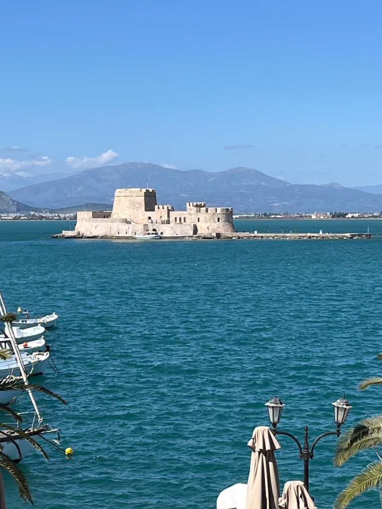 Our final excursion was to a small town called Nafplio (or Nauplio) 86 miles (139 kilometers) southwest of Athens. We found out about this hamlet from Rick Steve’s guide. Nafplio was an important sea port during the Middle Ages and features beautiful views of the Mediterranean Sea, a cute city center, and ruins (of course). Our plan was to just take a bus to the town, explore, and come back to Athens. Unfortunately but not surprisingly, Yahm got a cold and stayed behind to rest. Adam went on his own and had a fun day. Overall, Adam is of the opinion that the town offered a beautiful reprieve from Athens and is worth returning to with Yahm.