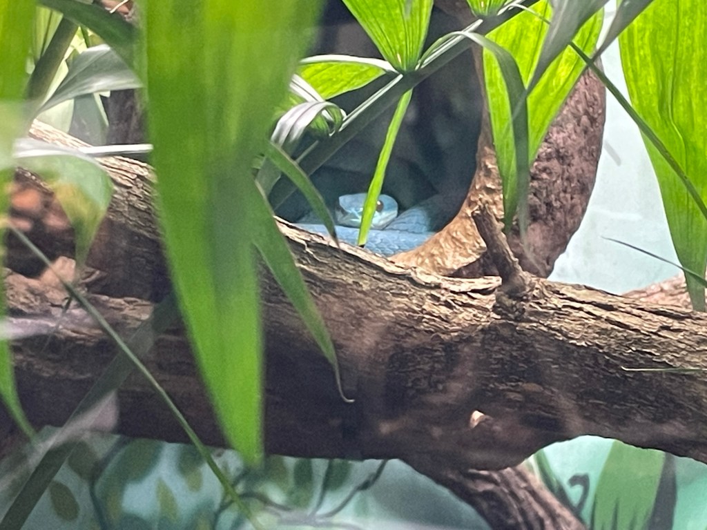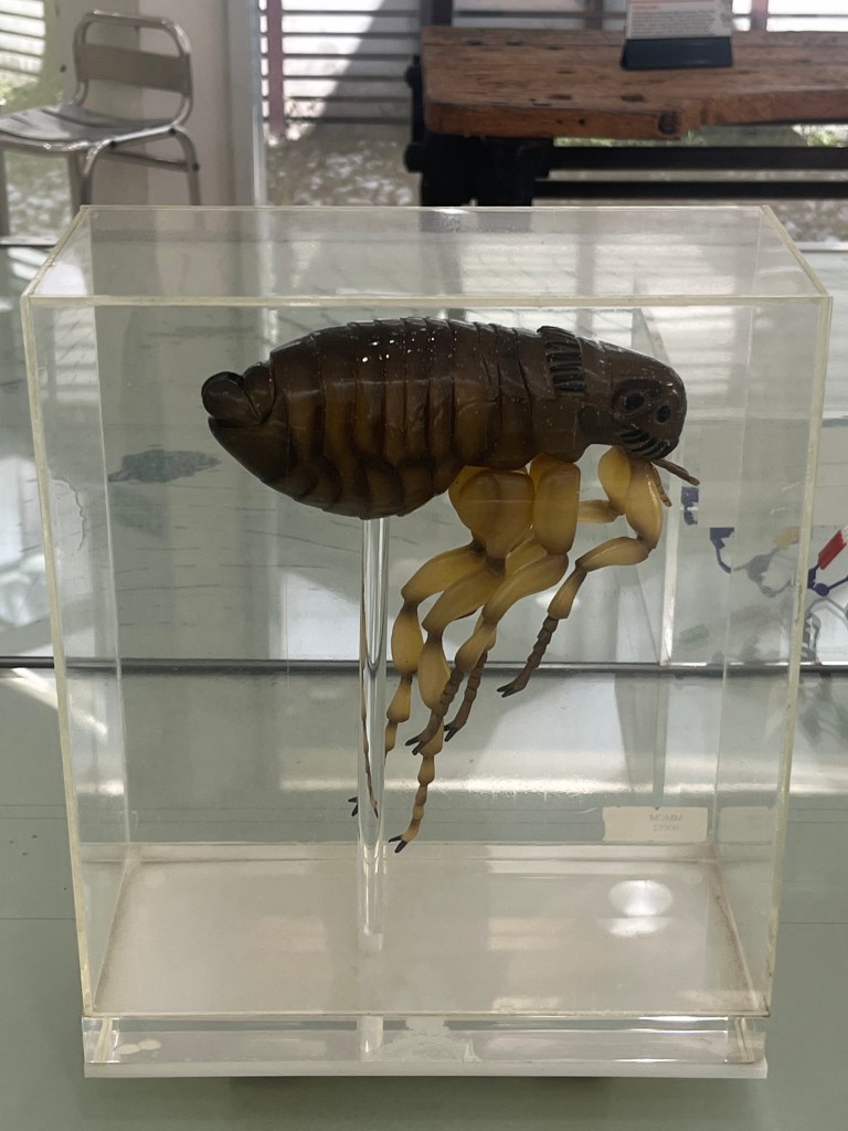 Bottom row, left to right: plastic model of a flea at the Microbiology Museum; plastic model of a white blood cell eating bacteria at the Microbiology Museum; a White-lipped Island Pitviper at the Sepentarium
