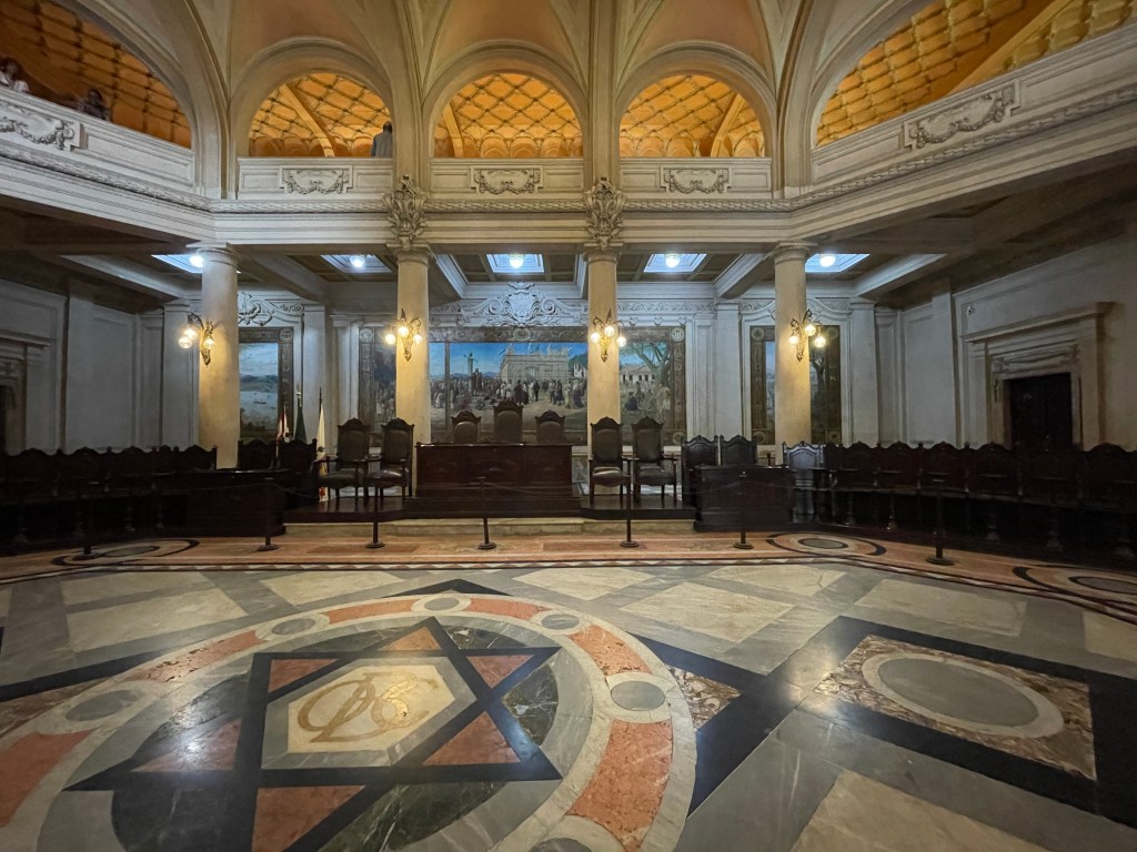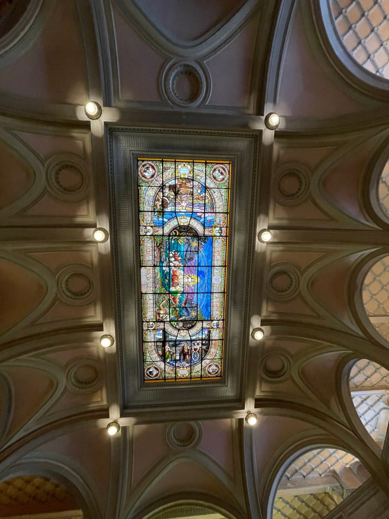 Bottom row, left to right: the area where meetings were held (not sure why there’s a Magen David in the center of the floor); the famous stained glass ceiling above the meeting area