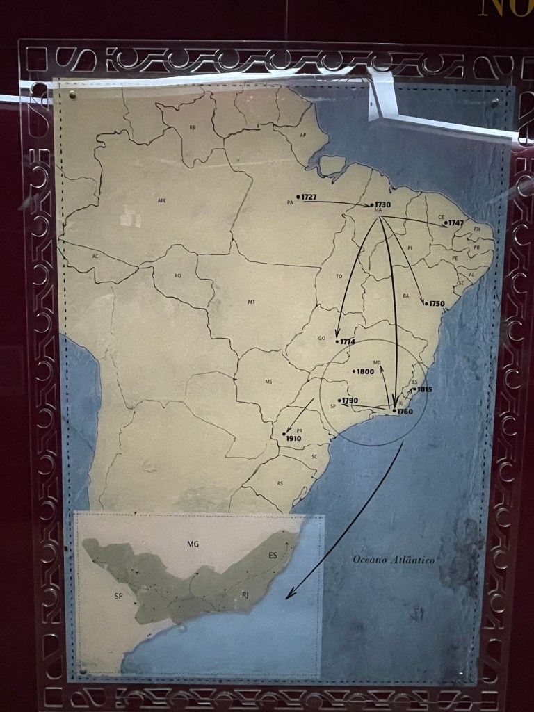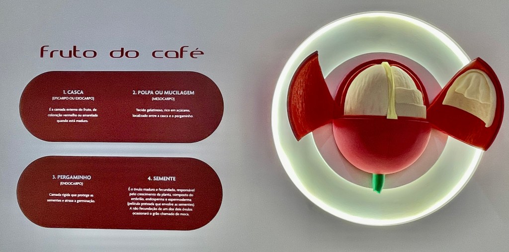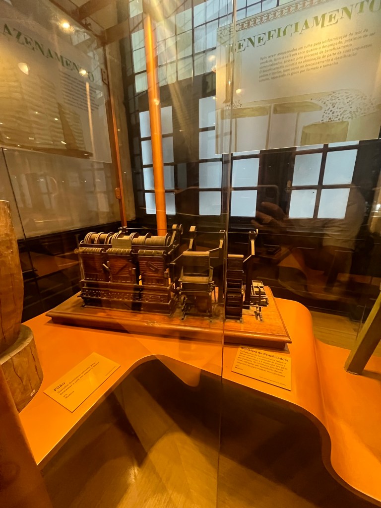 The primary exhibit at the Coffee Museum focuses on the history and distribution of coffee, with an emphasis on Brazilian coffee production. The exhibit begins with the discovery and initial cultivation by humans in the Horn of Africa and Arabian Peninsula, how coffee spread throughout the tropics worldwide, and the ways distribution processes have changed over time. A separate exhibit focuses on the production cycle of coffee. Not only does the exhibit teach about the different stages of washing and roasting, but visitors are encouraged to smell and taste Brazilian coffee.