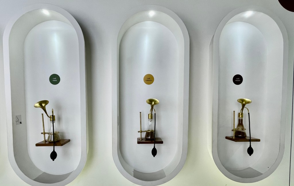 Third row, left to right: sniffers for visitors to explore different types of coffee beans; a 3D model of the interior of a coffee cherry and seed (the seed turns into a coffee bean)