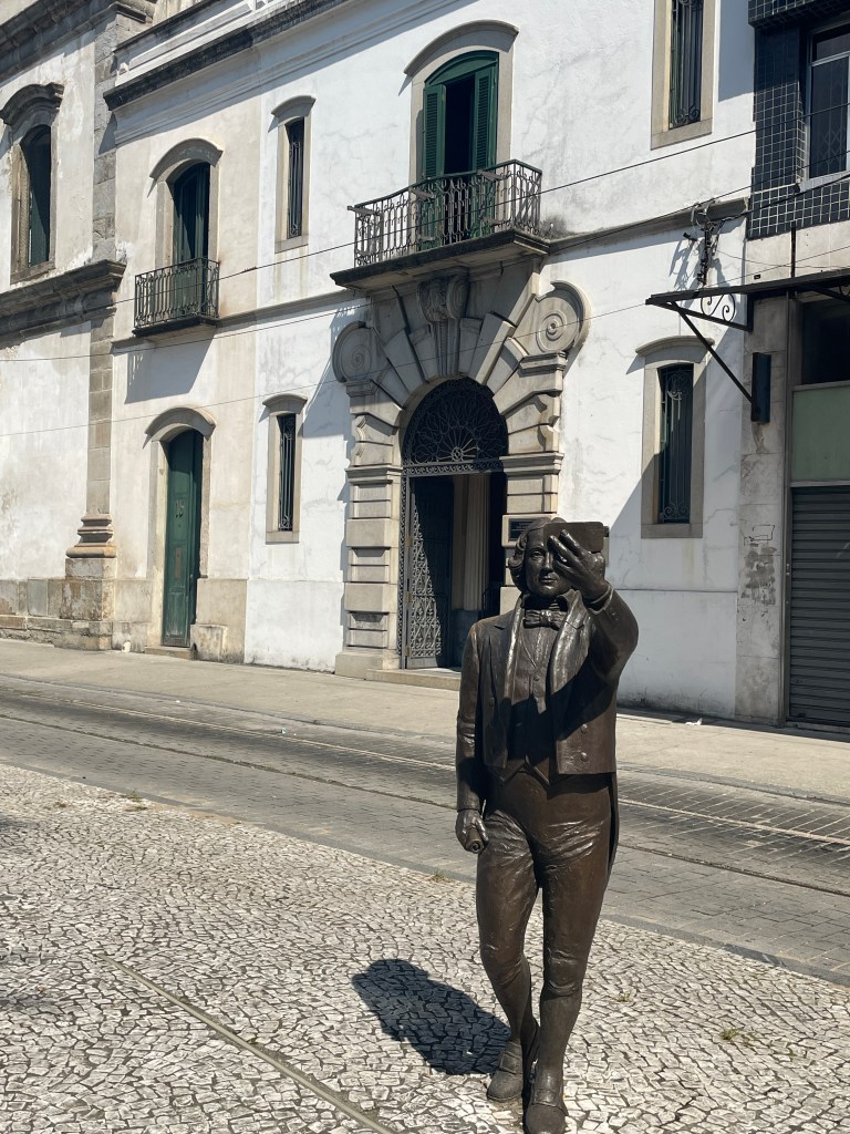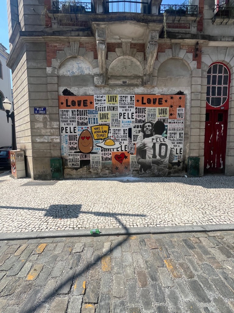 Top row, left to right: street view in downtown Santos; collage/mural about Pelé, love, and eggs (not sure why there were eggs all over town); a statue of someone taking a selfie outside the Pantheon