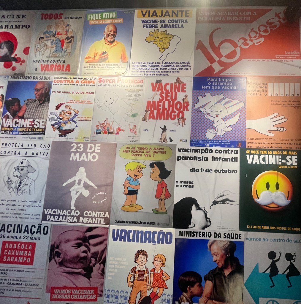Top row, left to right: one of the many beautiful walkways at the Butantan Institute; a collage of vaccination posters created by the Brazilian government