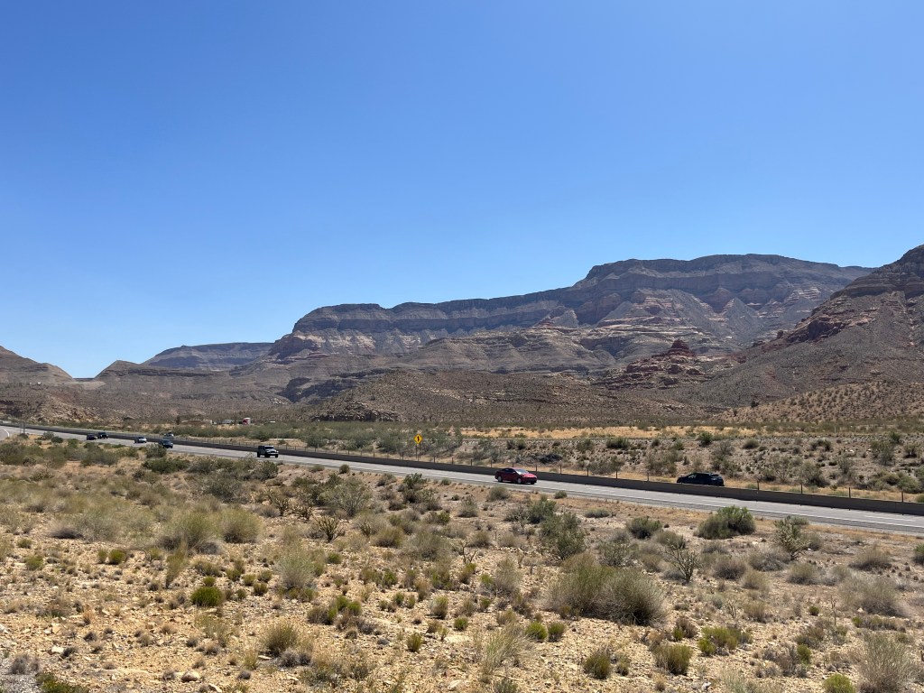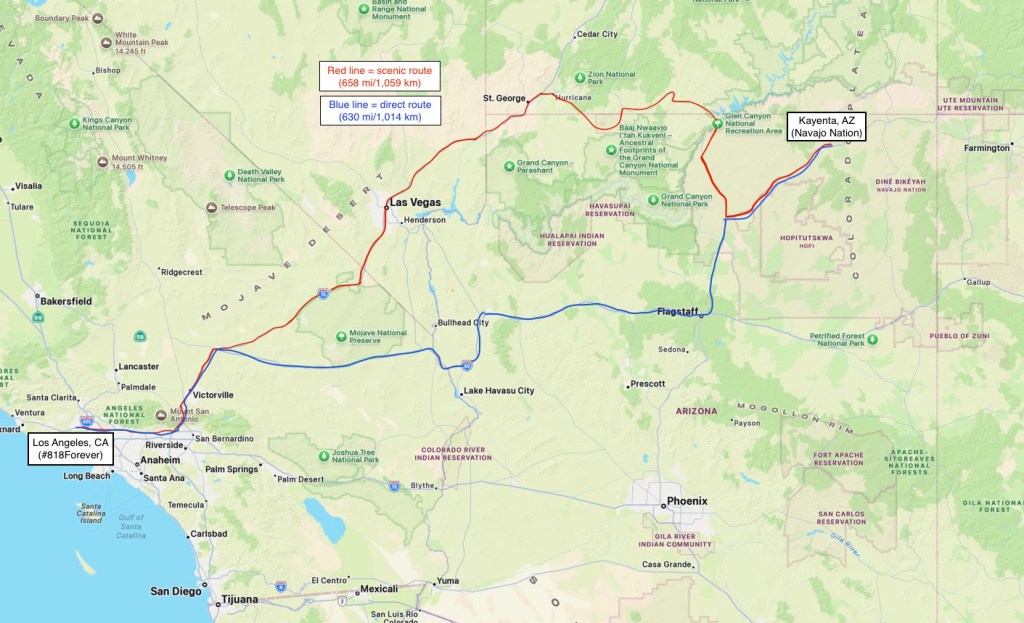 The next day, it was time to head back to Los Angeles. Rather than drive directly from the northeastern corner of Arizona to Southern California, we decided to take the scenic route. It only added an hour, but we had the opportunity to visit parts of Arizona, Utah, and Nevada we had never seen before. One of our bucket list goals is to drive along all of the interstates in the United States, so we also got to check off more of Interstate 15 (I-15). Below is a map of the direct route (blue line) and the scenic route (red line).