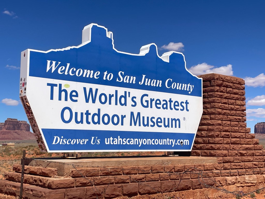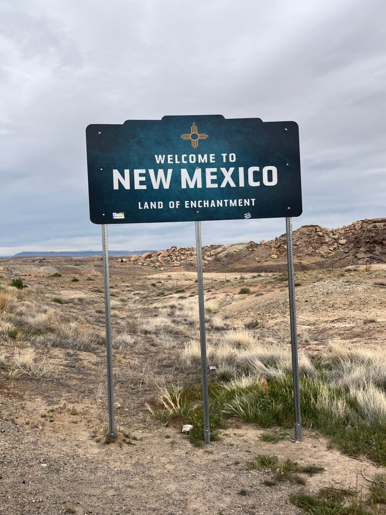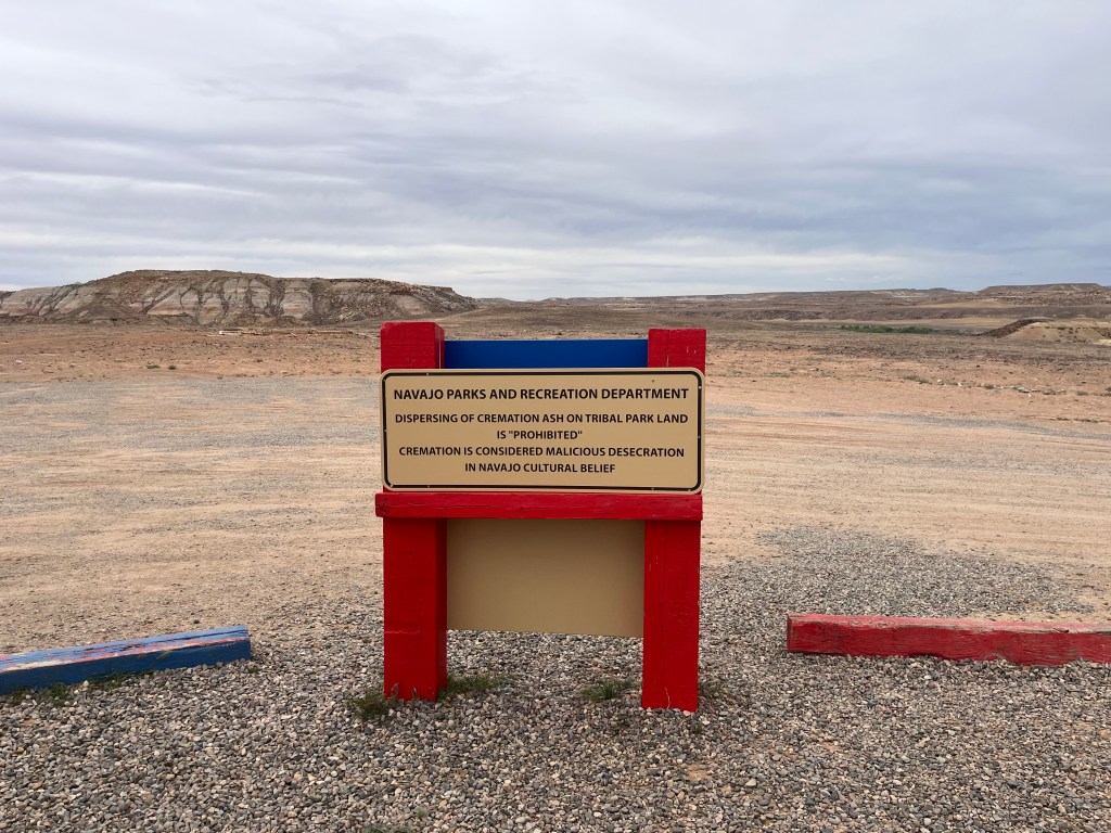 Second row, left to right: Navajo Nation welcome sign; a sign restricting the spread of ashes in the monument because it is disrespectful to Diné beliefs; New Mexico welcome sign
