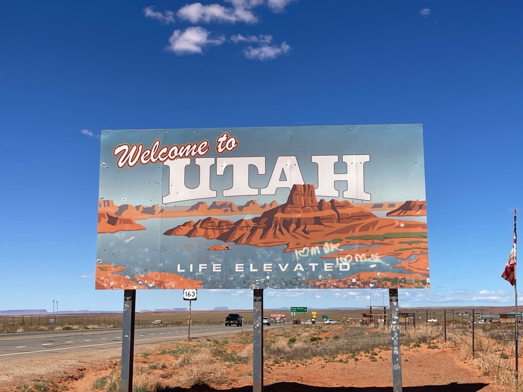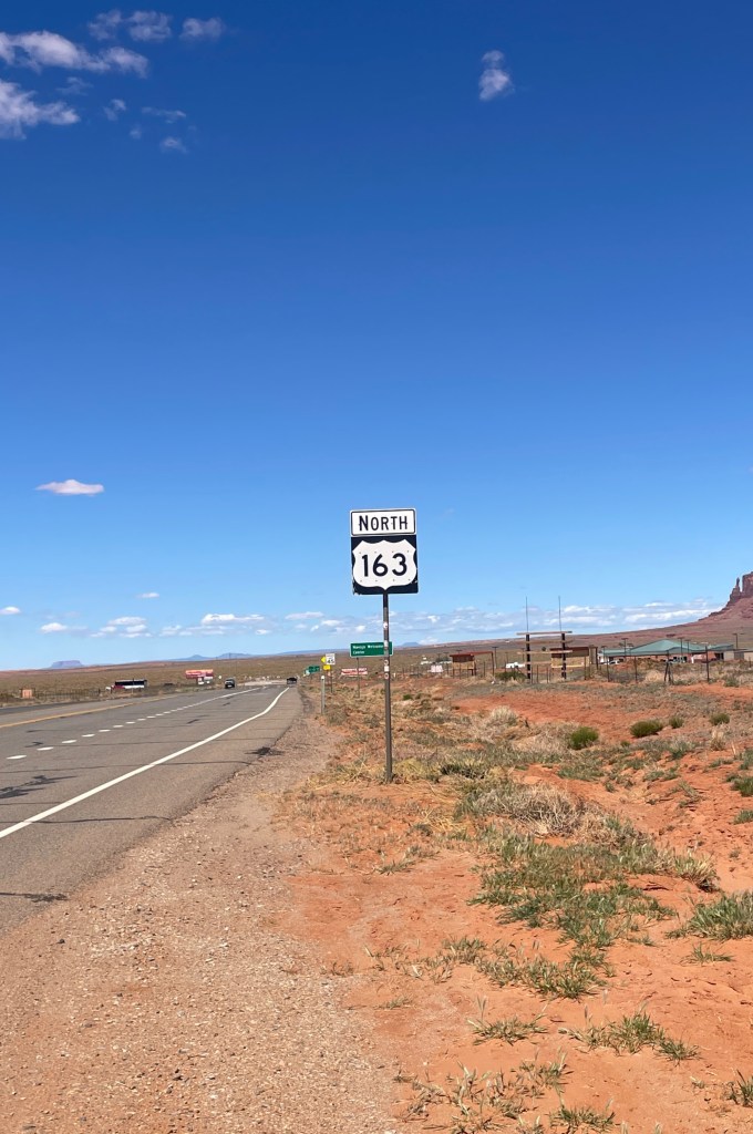Top row, left to right: Signage for US Highway 163; welcome signs for Utah and Arizona