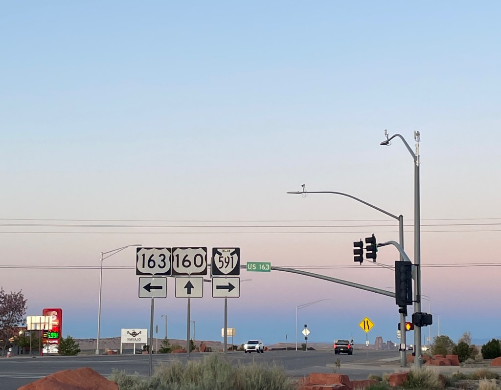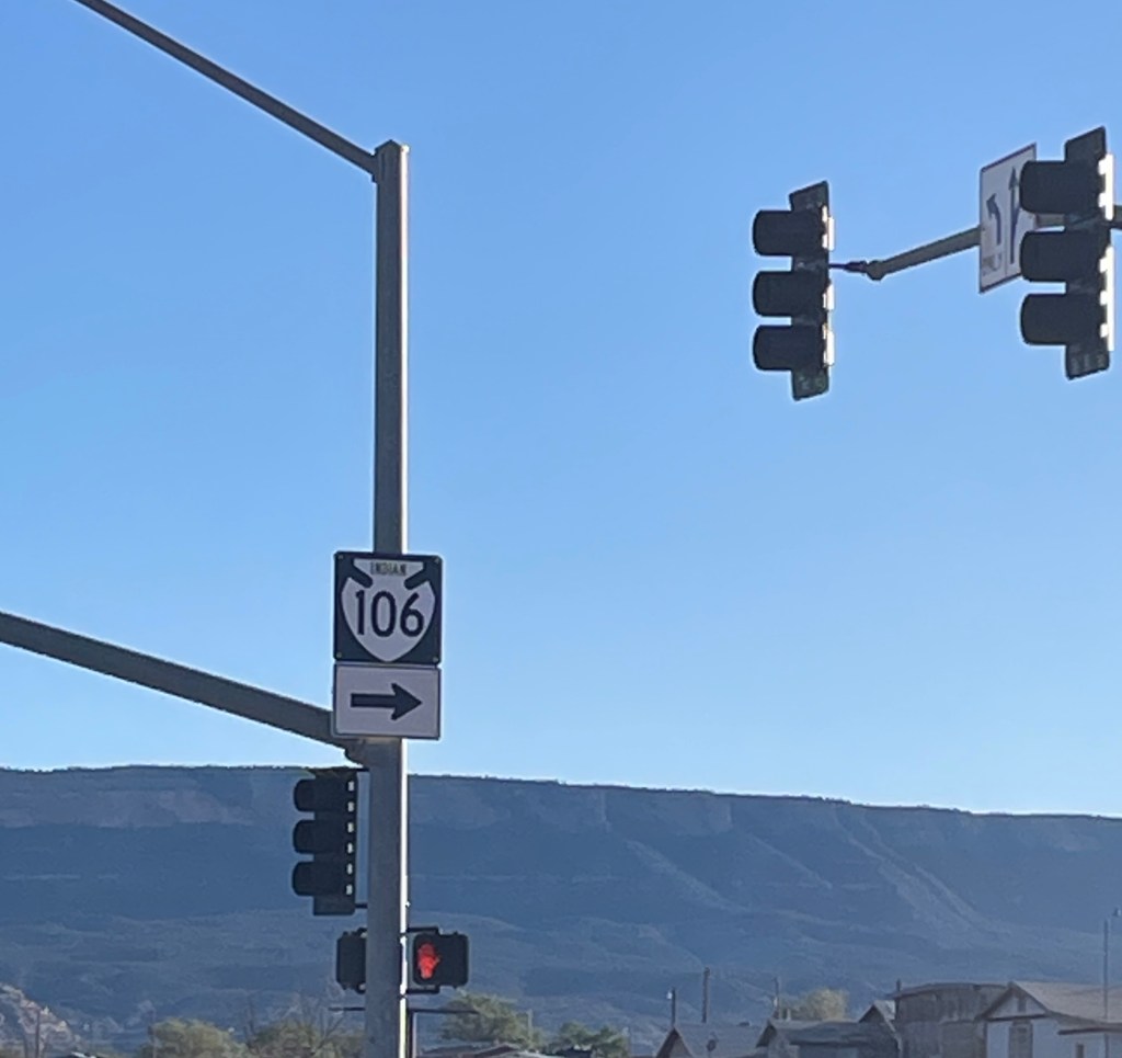 Photos, left to right: a sign for Indian Road 106; signs displaying a junction where US Highways 160 and 163 meet with Indian Road 591