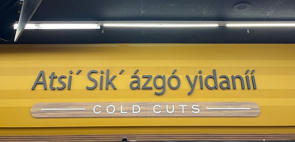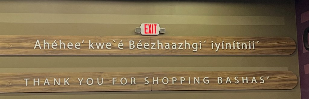 Bottom row: signage in a grocery store in Diné and English